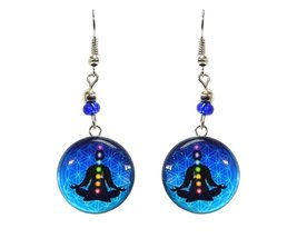 Acrylic New Age themed round Chakra earrings with beaded hooks and silver setting. The seven chakras are the centers in our bodies in which energy flows through.