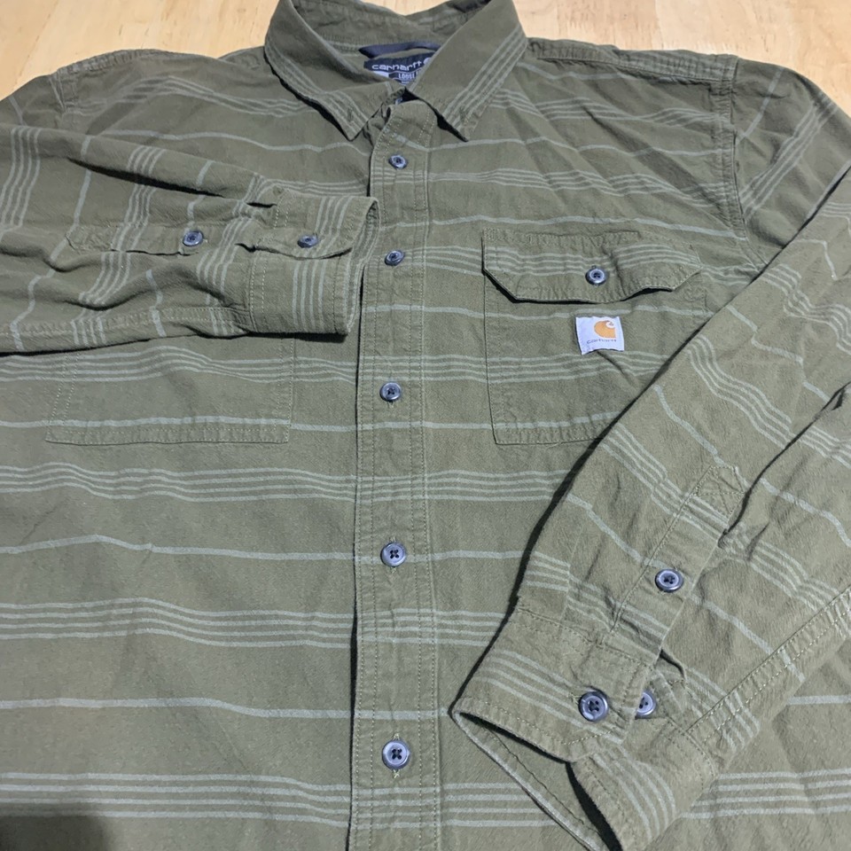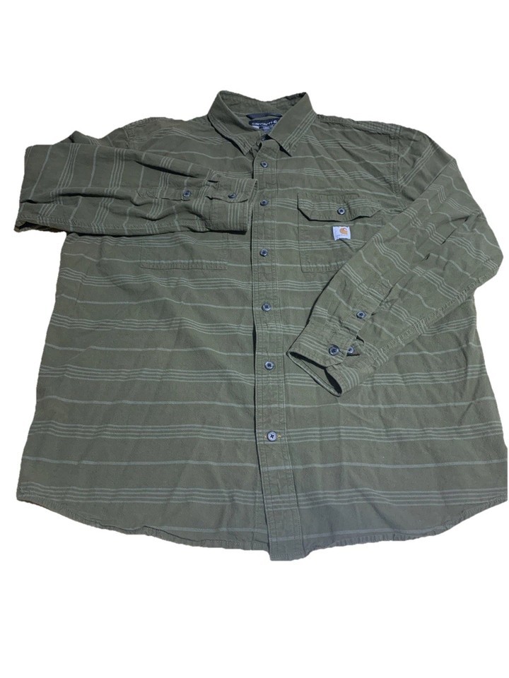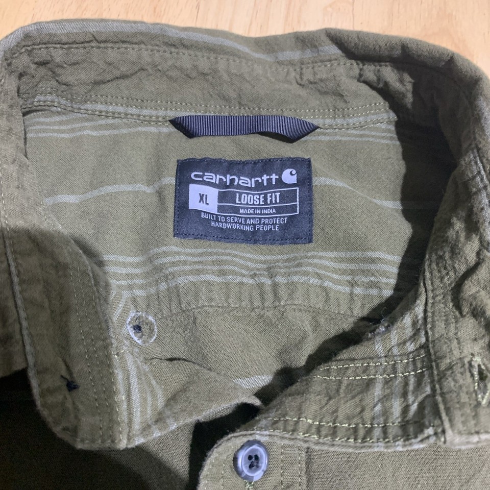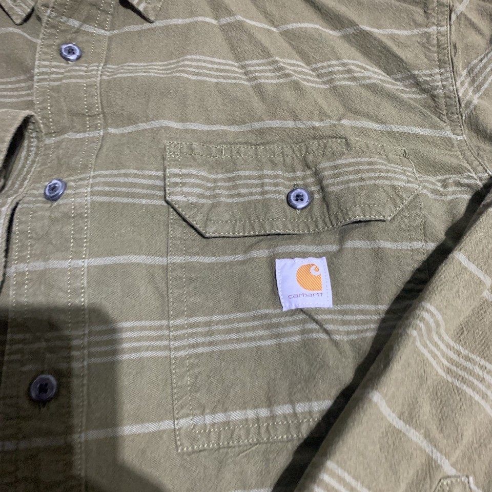 Elevate your casual wardrobe with this Carhartt Loose Fit Hardworkind People Long-Sleeve Plaid Shirt in Men's XL. Made of high-quality cotton chambray fabric, this button-up shirt is perfect for everyday wear. Featuring a classic plaid pattern in green, this shirt is a great addition to any outfit. The loose fit design ensures maximum comfort, while the long sleeves provide warmth and protection during cooler months.