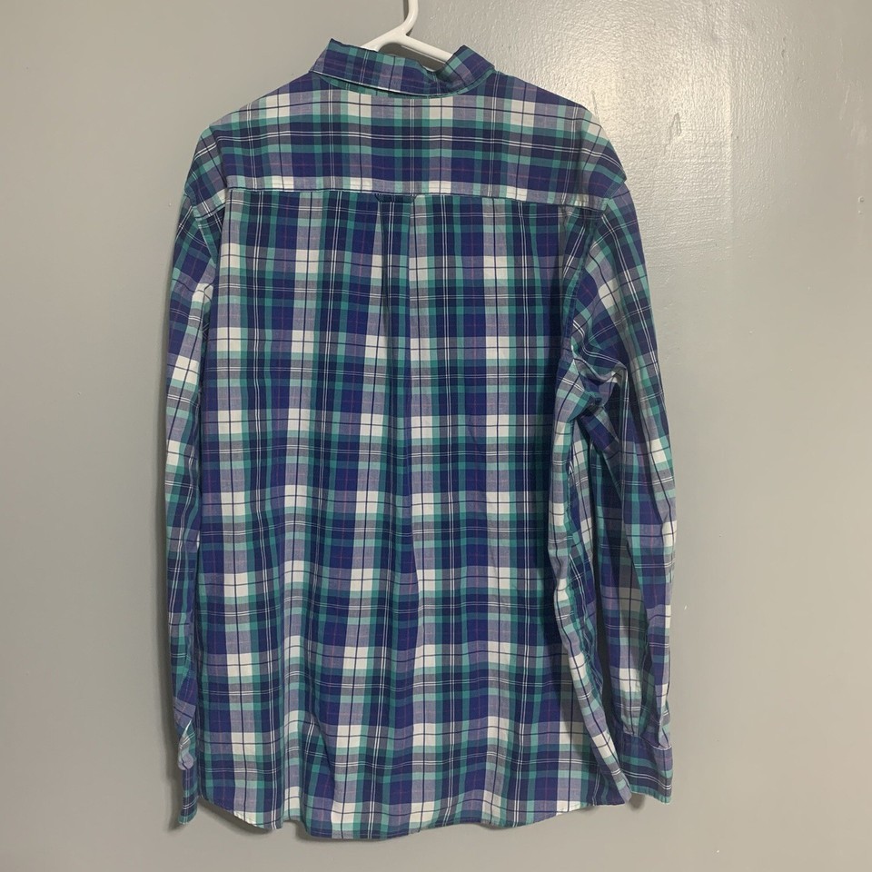 Upgrade your wardrobe with this stylish Chaps men's shirt in a blue plaid pattern. Featuring a button-down collar and long sleeves, this shirt is made of a comfortable cotton blend material with a canvas fabric type. The shirt is accented with a button and Chaps logo, and it comes in a size XXL with a regular fit.