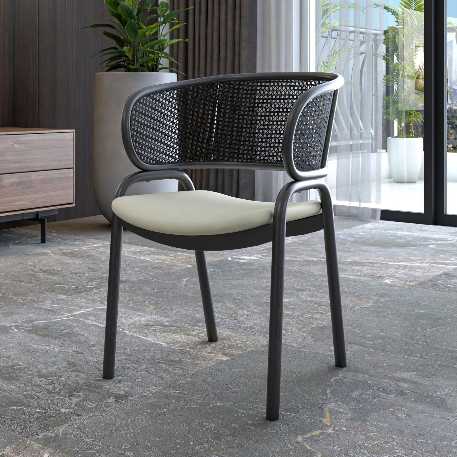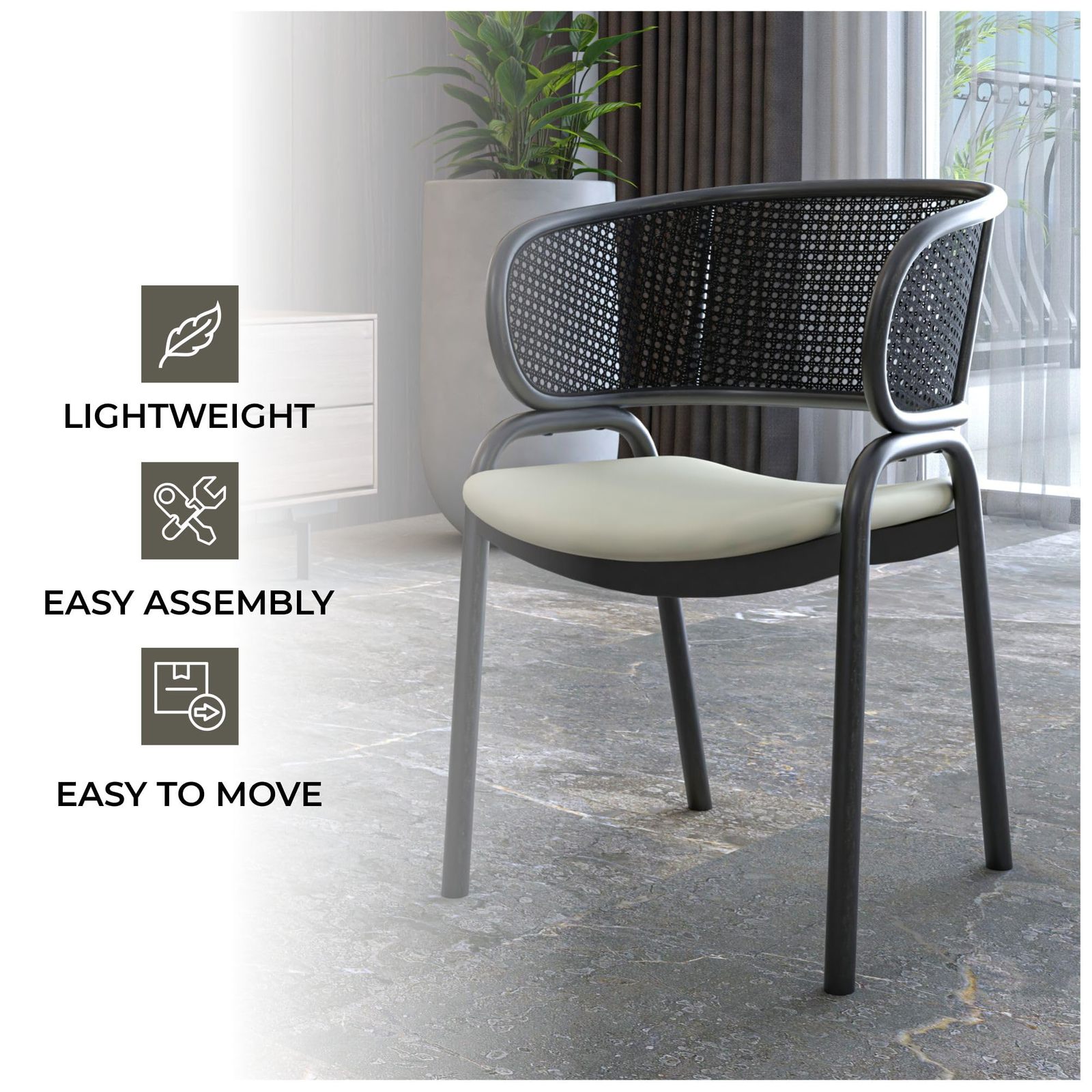 Immerse yourself in the perfect blend of chic style and ultimate comfort with our stylish Ervilla dining chair. Featuring a sleek curved shape and a charming rattan back, this chair adds a unique and inviting allure to any room. The black metal frame with stiletto-inspired legs exudes modern sophistication, while the cushion seats ensure comfort during meals or gatherings. Experience the luxurious relaxation with the LeisureMod Ervilla modern dining chair. Its premium foam-filled seat ensures comfort during extended periods of sitting, whether you're dining, conversing, or unwinding. The curved armchair and back design add elegance and essential support Feel confident in the dining chair. Its sturdy metal legs offer unmatched stability and durability, providing peace of mind with every use. Crafted with robust iron legs and a powder-coated finish, this chair ensures long-lasting support and protection against scratches, wear, and rust. Enjoy both style and reliability in your living spaces with this elegant and durable seating option. Indulge in luxurious seating with the modern dining chair, meticulously crafted to provide ample room for optimal comfort during dining or leisurely moments with friends and family. Measuring 29.14 inches in height, 22 inches in width, and 20.35 inches in depth, this accent side chair offers generous space to relax, dine, or engage in lively conversations, ensuring a comfortable and inviting dining experience for all. Transform any corner of your home into a welcoming oasis with the Ervilla modern dining chair. Seamlessly combining elegance with comfort, this upholstered accent side chair is perfect for various spaces, including the living room, dining room, kitchen, or bedroom. With its rattan curved design and foam-filled seat upholstered in fabric, it adds a touch of sophistication and coziness to your interior decor. Elevate your home ambiance with this versatile and stylish chair. Keeping your modern dining chair clean is easy. Just wipe it down with a dry or damp cloth, and you're good to go. This simple cleaning routine ensures your chair stays in great condition for a long time, giving you peace of mind and saving you time and effort. Setting up your modern dining armchair is a breeze. With clear instructions and just one or two people, you can assemble it quickly and easily. Enjoy the convenience of putting together your new accent side chair effortlessly, allowing you to start enjoying its comfort and style right away.