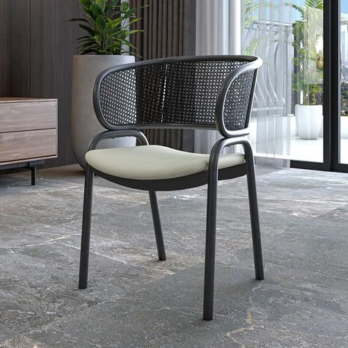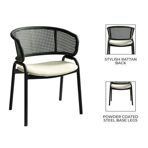 Bullet point: [DESIREABLE DESIGN] Immerse yourself in the perfect blend of chic style and ultimate comfort with our stylish Ervilla dining chair. Featuring a sleek curved shape and a charming rattan back, this chair adds a unique and inviting allure to any room. The black metal frame with stiletto-inspired legs exudes modern sophistication, while the cushion seats ensure comfort during meals or gatherings.