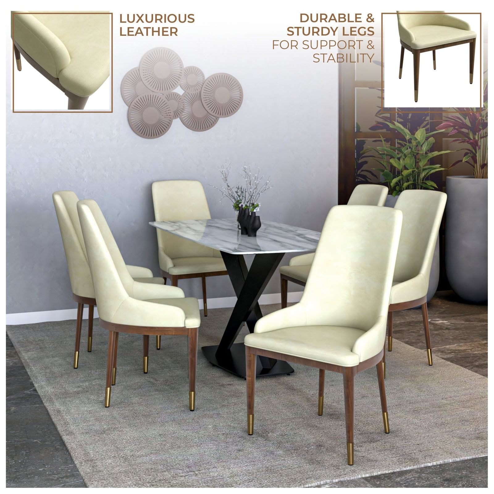 Epitome of modern elegance, featuring high-quality leather upholstery for a luxurious look. The stylish rubberwood legs add a touch of natural beauty and perfectly complement the sleek leather finish. The harmonious blend of materials creates a sleek and contemporary design, fitting seamlessly into various interior décors. Designed for ultimate comfort, featuring a foam-padded seat and backrest. This ensures you can sit comfortably for long dinners and social gatherings. The high-quality foam conforms to your body, providing excellent cushioning and support. Whether for family dinners or casual evenings with friends, this chair allows you to relax and enjoy every moment without discomfort. This accent dining chair fits effortlessly into any room, whether it's the dining room, living area, kitchen, or home office. Its adaptable style and modern design enhance any atmosphere, offering comfortable seating for extended periods. It's more than just a side chair; it's a practical and chic addition that revitalizes your rooms, making them welcoming and functional. Built to last with durable rubberwood legs, providing stable and long-lasting support. Whether for daily dining or as an accent chair, its robust design ensures it stays strong and reliable. Enjoy comfort and style without worrying about wear and tear, making it a practical choice for any room in your home. With dimensions of 38.85 inches in height, 20.48 inches in width, and 24.03 inches in depth, it offers ample room for various activities, enhancing functionality and comfort in your living space. The dining chair features a high-quality leather surface that’s incredibly easy to clean. Just wipe it down with a damp cloth to keep it looking fresh and new. This easy-to-clean design saves you time and hassle, making it perfect for busy households and high-traffic areas. Enjoy a stylish and sophisticated chair that stays effortlessly beautiful day after day. Enjoy instant convenience with the Dining Chair—no assembly needed. Simply unpack and place it in your desired spot, and you're ready to enjoy its stylish comfort without any hassle.