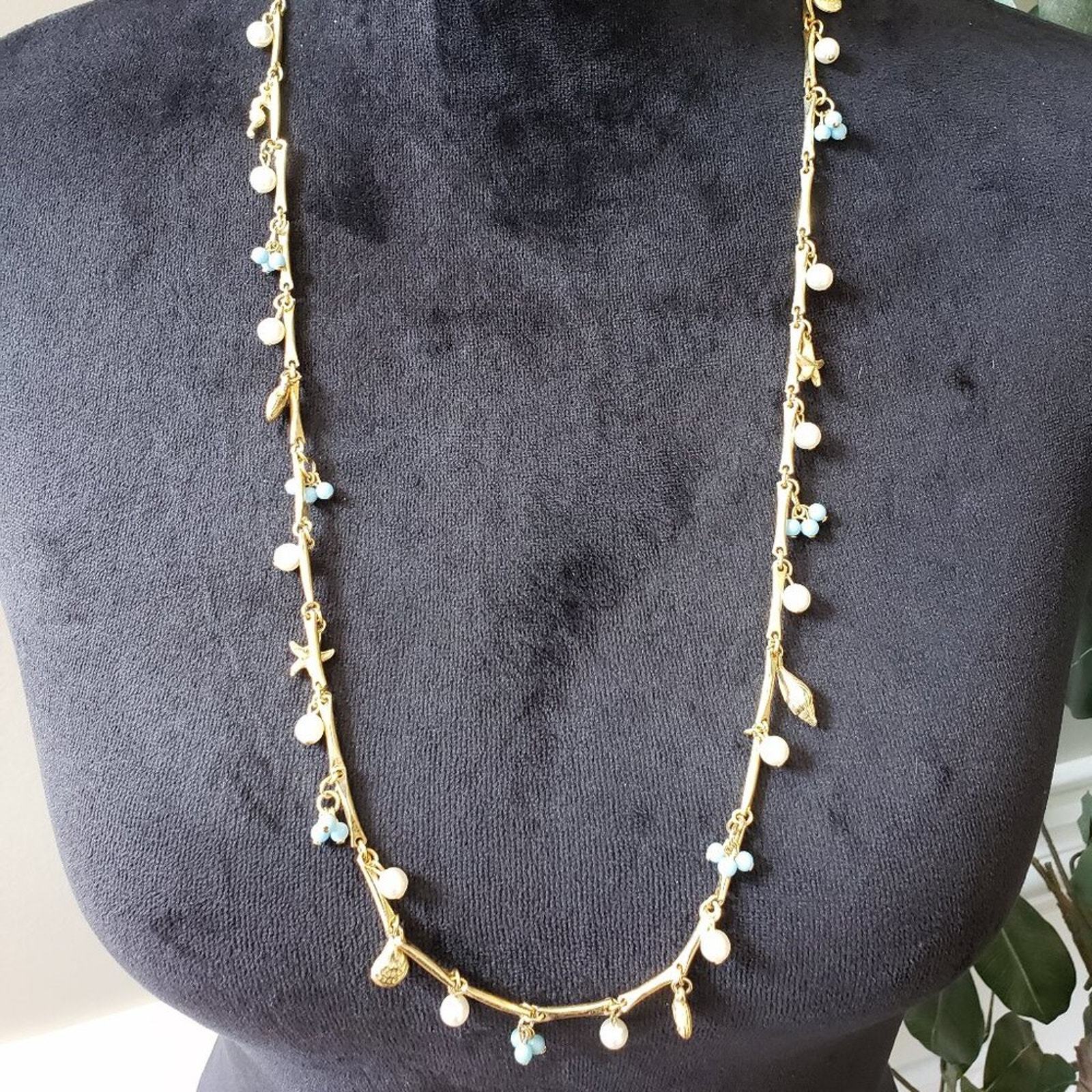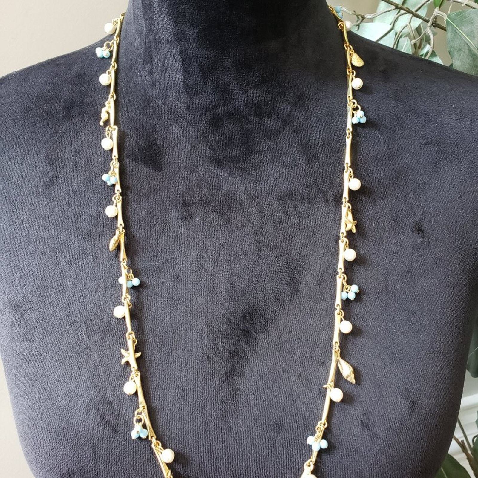 Womens Fashion White Blue Faux Pearl Gold Tone Star Snail Accent Long Necklace.
