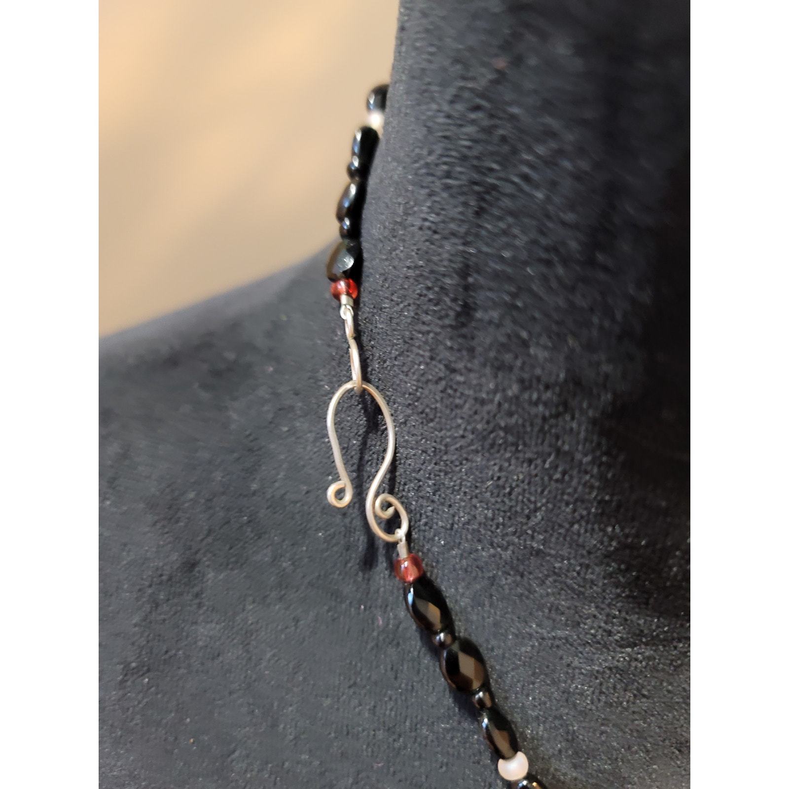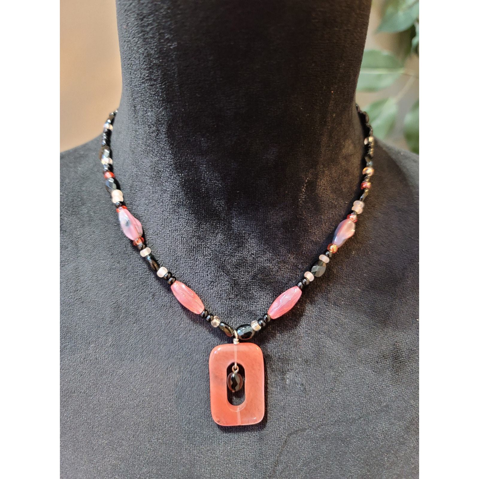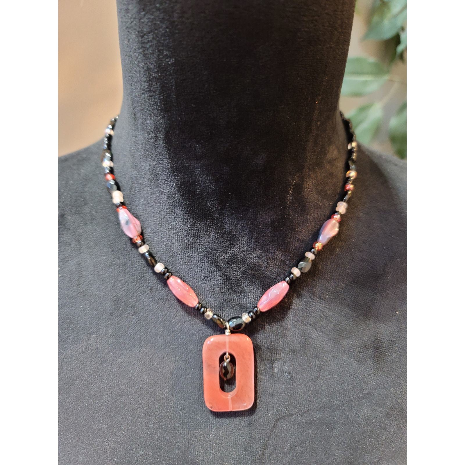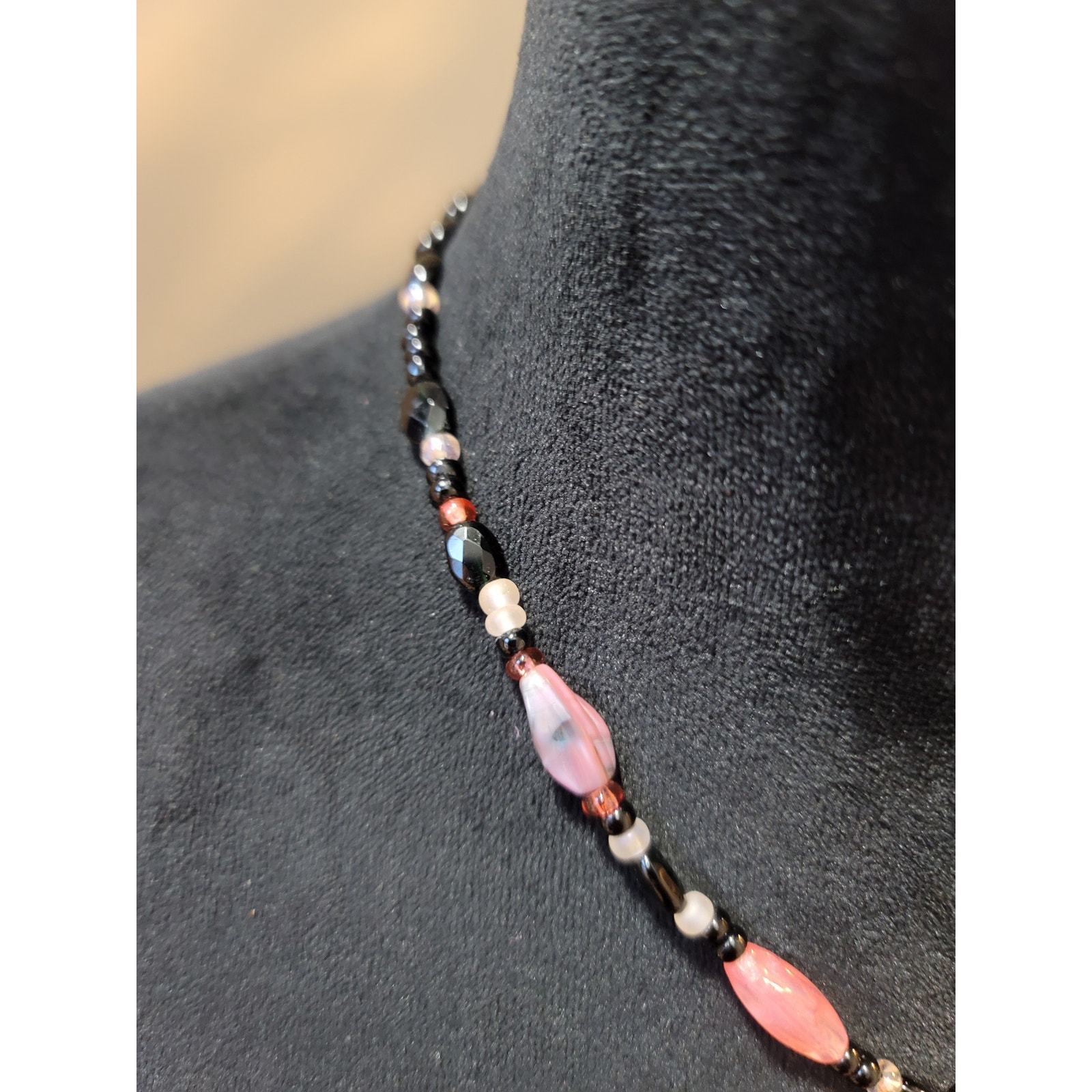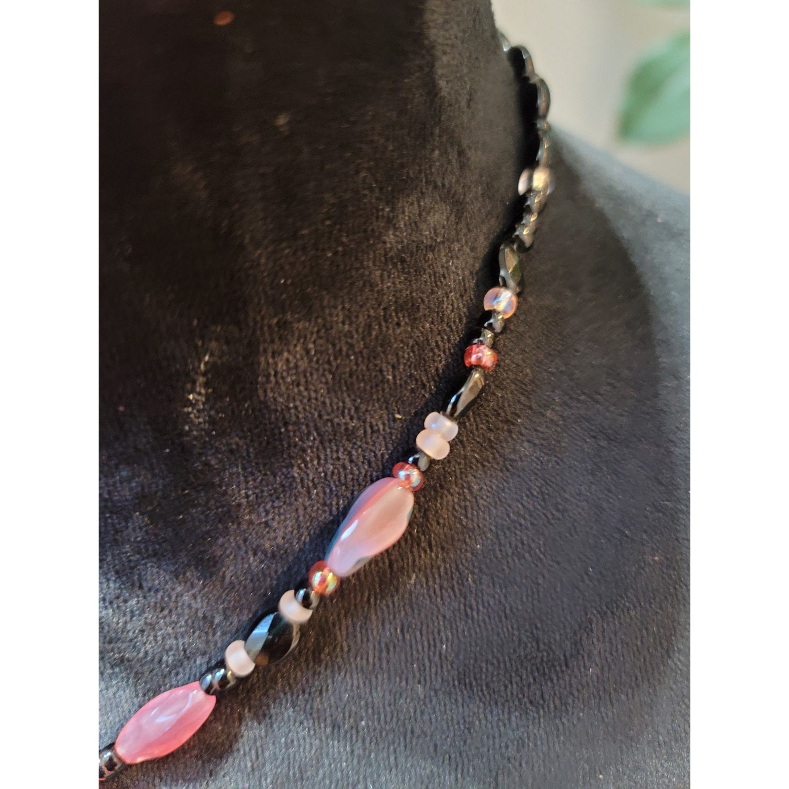 Women's Pink And Black Beaded Necklace With Oval Pendant Hook Clasp Jewelry