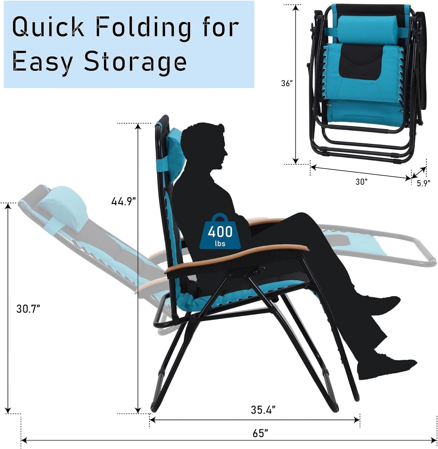Zero Gravity Reclining Chairs: The Length of extra long chair when fully reclined is large enough for big and tall people 6'2". Strong double bungee rope and stainless steel tube frame are durable for using a long time. The maximum loading capacity is 400lbs