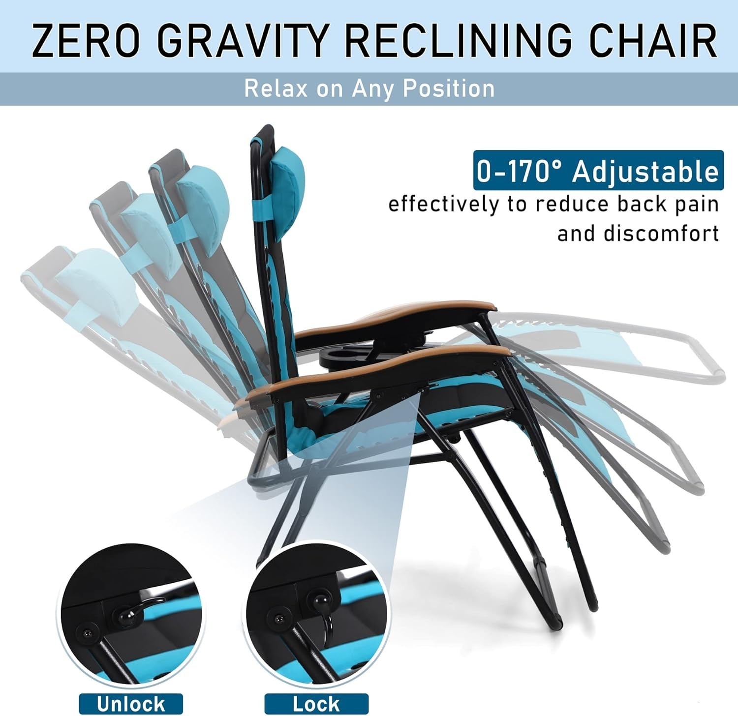 Adjustable Position: The Anti Gravity Recliner is designed with a locking system and can be adjusted to any positions with 0-170 degrees to your preferences. Smoothly glides to an ergonomic zero-gravity position, with elastic cords that immediately adjust to your body