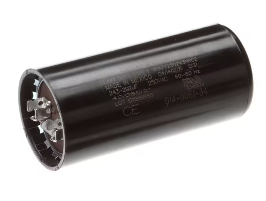 Traulsen 61A7T250243NRC2, 014-0061-34 Start Capacitor, 250V, 243?292uF is a heavy-duty OEM start capacitor engineered to deliver the initial surge of power needed for motor startup in commercial refrigeration systems. With a capacitance range of 243?292 microfarads (uF) and a 250V AC rating, this capacitor provides strong, consistent startup torque, ensuring dependable operation in high-demand environments. The round metal casing and quick-connect terminals make it ideal for fast replacement and long-term reliability.
