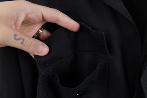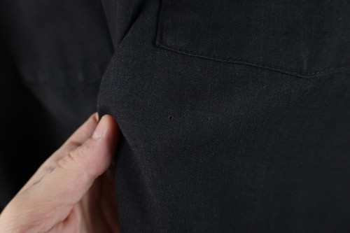 Missing buttons. Hole where button was sewed. Blemishes throughout. Hole front . Collar discolored. Has color fade. USA made