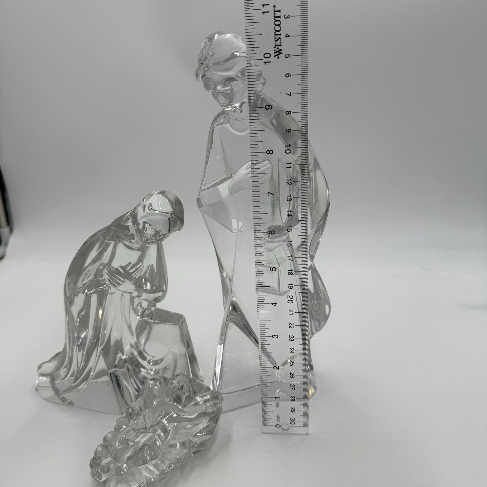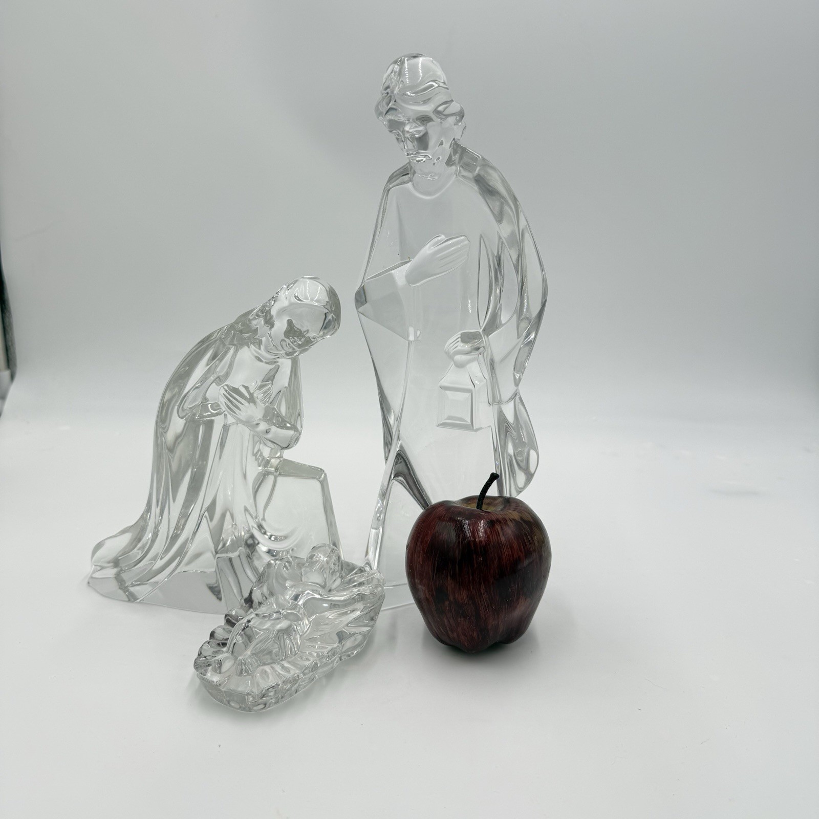 The Mikasa Large Lead Crystal 3 Piece Nativity Set is a vintage collectible set manufactured in Germany in 1990. This set includes figures of Jesus, Joseph, and Mary, each made of clear lead crystal and measuring 11 inches for Joseph, 6.5 inches for Mary, and 3 inches for Jesus. The set is perfect for all occasions, especially Christmas, and is original in terms of its design. The Mikasa brand is known for its quality and this Nativity set is a timeless piece that would make a beautiful addition to any holiday decor collection.