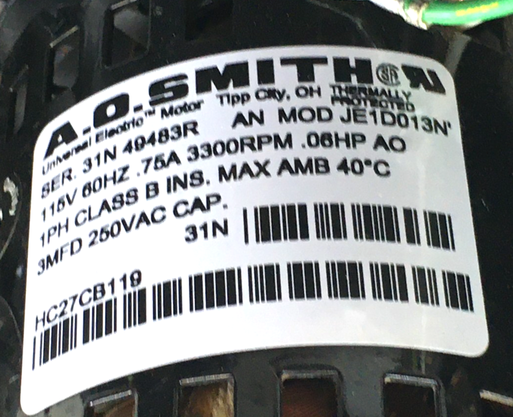 This is A.O. SMITH JE1D013N Draft Inducer Blower HC27CB119 3300 RPM 115V 60Hz used part.