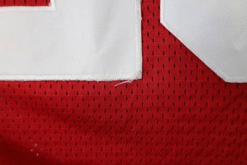 Loose threads, blemishes on numbers. Collar, back top has fabric pulls