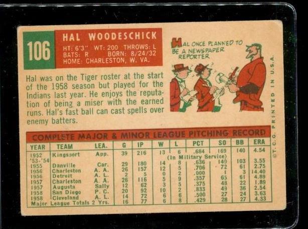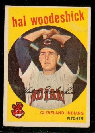Vintage 1959 Topps Baseball Trading Card #106 Hal Woodeschick Cleveland Indians. Raw and ungraded. Smoke and pet free.