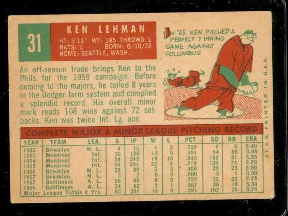 Vintage 1959 Topps Baseball Trading Card #31 Ken Lehman WB Philadelphia Phillies
