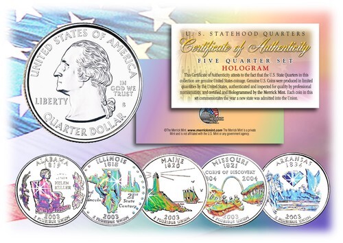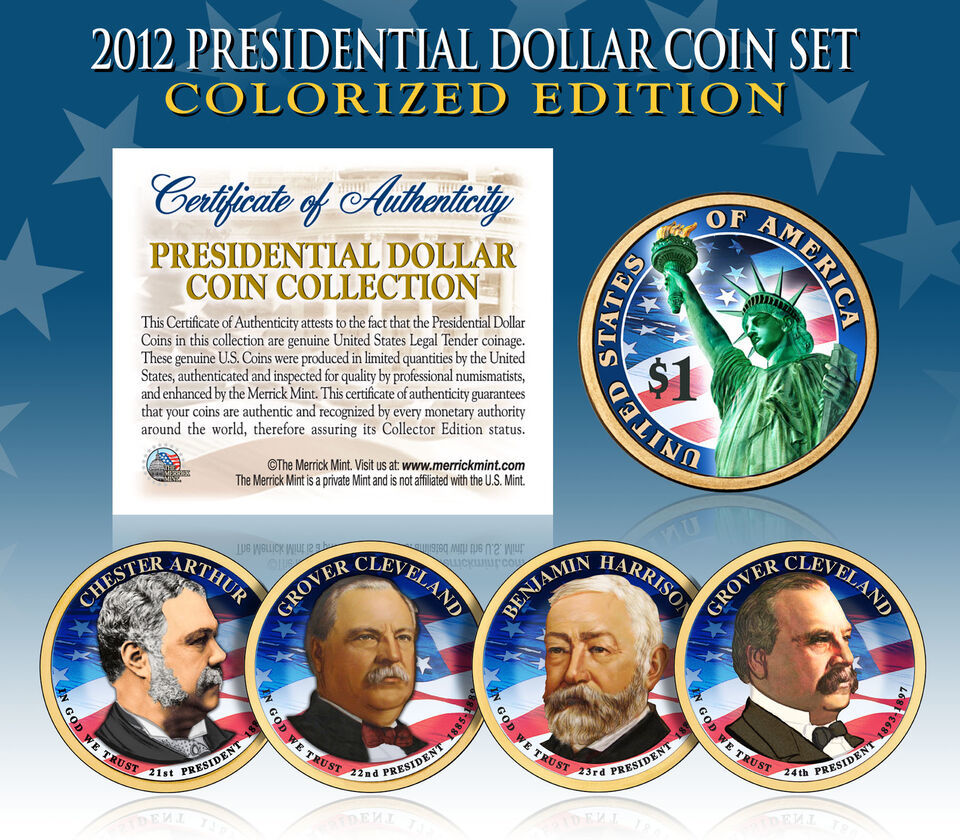 Here is your chance to own a complete set of four (4) beautifully colorized 2012 Presidential $1 U.S. Coins featuring four U.S. Presidents: C. Arthur, G. Cleveland (1st Term), B. Harrison, G. Cleveland (2nd Term). Each coin is beautifully enhanced in permanent full-color by the Merrick Mint to highlight the original design using a unique colorizing process, which involves the application of special inks directly to the surface of a coin. The result is an everlasting colorized coin collectible of ultra-high quality that is #1 in the industry. Each coin features a common reverse design of the Statue of Liberty and a unique Presidential portrait design on the obverse. Each coin is genuine legal tender of the United States and comes in an acrylic coin holder and includes a Full Color 2-sided Certificate of Authenticity. The United States Mint issues four Presidential $1 Coins each year. These coins feature large, dramatic artwork and edge-incused inscriptions of the year of minting, or issuance, E PLURIBUS UNUM and the mint mark. The inscription IN GOD WE TRUST appears on the face of the coins. The size, weight and metal composition of the Presidential $1 Coins are identical to that of the Native American $1 Coins.
