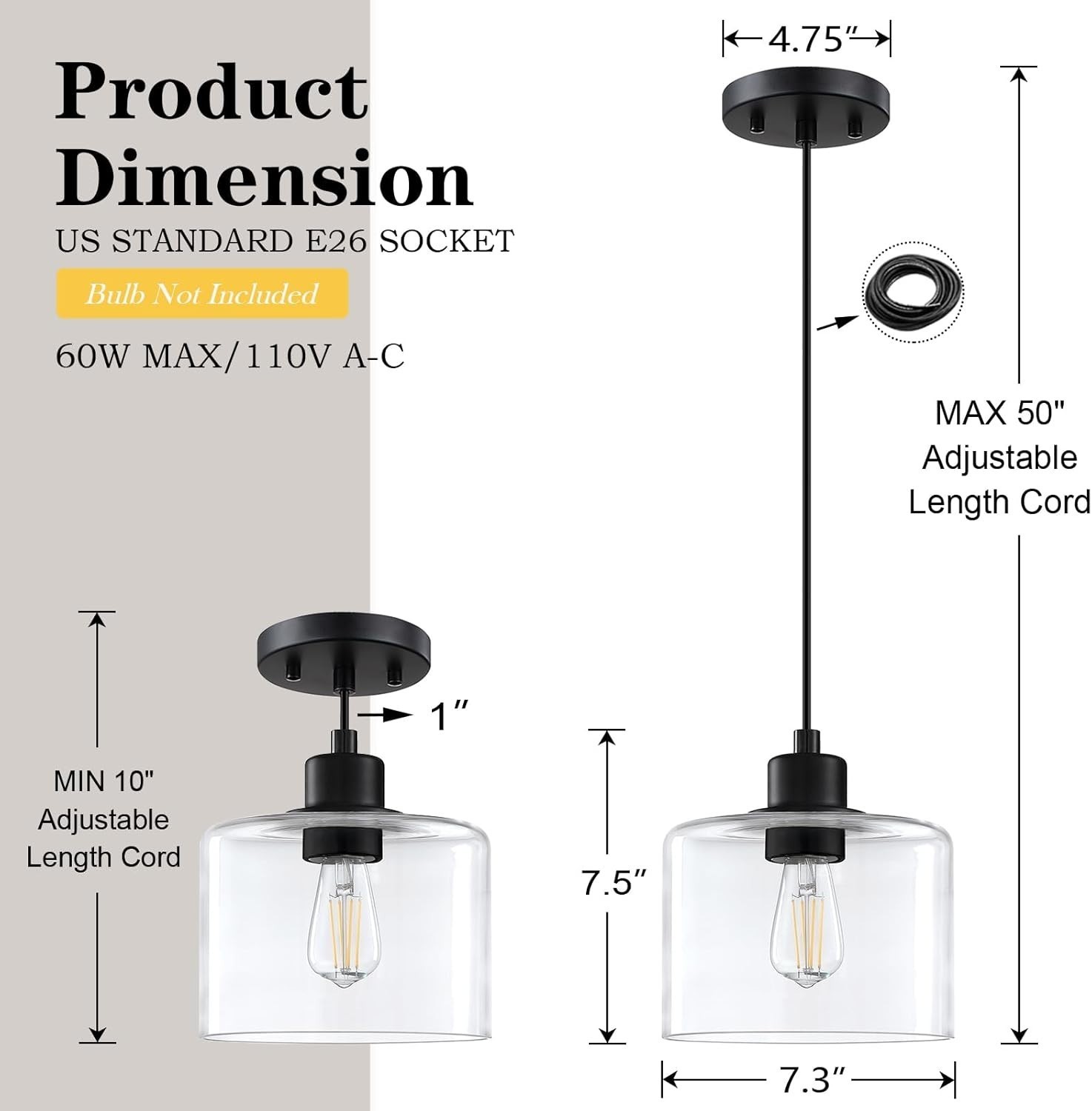 2.UL Certification Glass Pendant light size: H50"*W7.3".The length is adjusted by cord and can be installed on sloped, vaulted or flush ceilings.