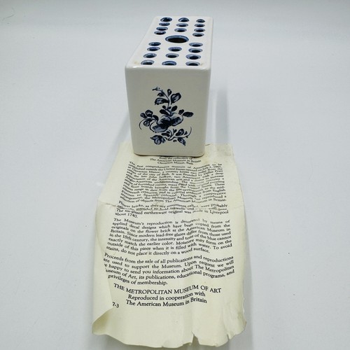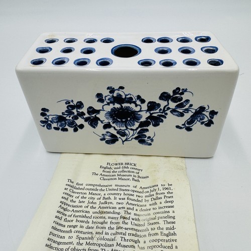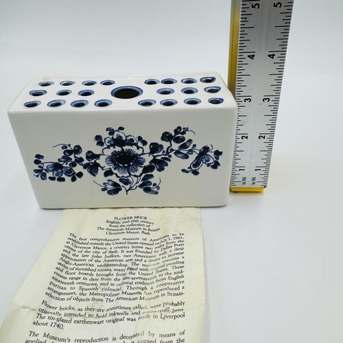 The Museum's reproduction is decorated by means of applied decal designs which have been copied from the originals on the flower brick at the American Museum in Britain. Since modern lead-free glazes differ from those used in the 18th century, the intensity and tone of the blue cannot exactly match the earlier color. Moisture may form on the outside of this piece when it is filled with water. To avoid stains, do not place it directly on a wood surface.