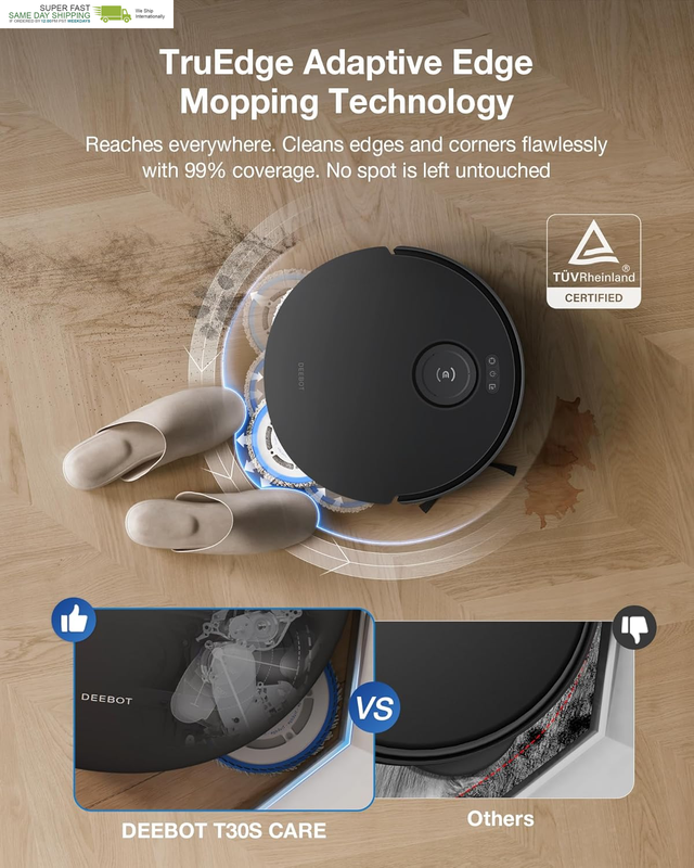 TruEdge Adaptive Edge Mopping - Equipped with TruEdge Technology, the DEEBOT T30S Care excels in cleaning edges and corners with unparalleled precision. By employing a hovering arm and advanced algorithms, it achieves 1mm accuracy and significantly enhances 99% coverage in hard-to-reach areas. No spot is left untouched.