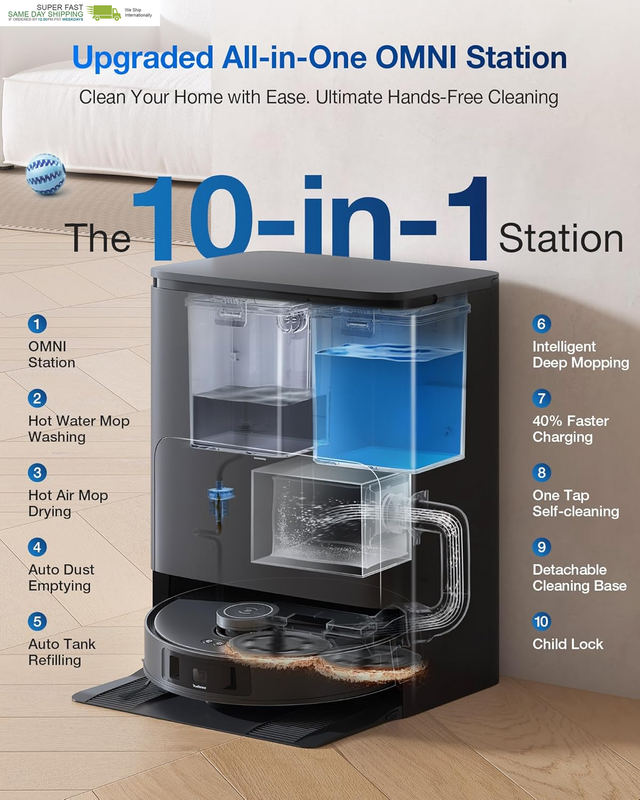 1 All-in-One OMNI Station 2 Intelligent Deep Mopping 3 Hot Water Mopping Washing 4 90 Days Smart Auto Empty 5 Easy-to-Clean Station