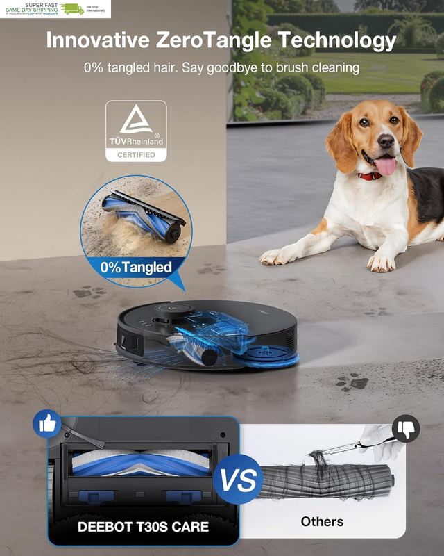 ZeroTangle Anti-Tangle Technology - Say goodbye to detangling hair and debris. Equipped with ZeroTangle technology, the DEEBOT T30S Care masterfully avoids entanglements of both human and pet hair on the main brush. This breakthrough minimizes maintenance, ensures a smooth, continuous and efficient cleaning.