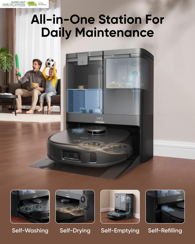 1 All-in-One Station 2 Self-Emptying 3 Self-Washing 4 Self-Refilling 5 Self-Drying