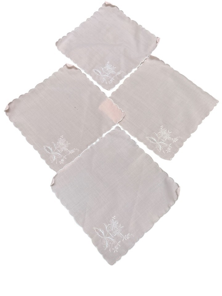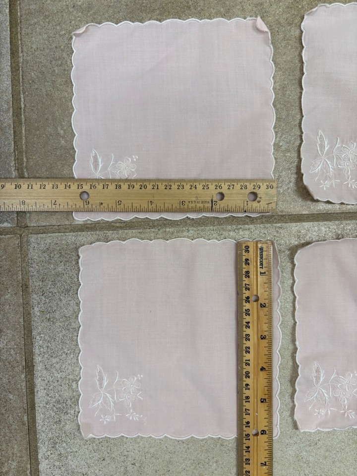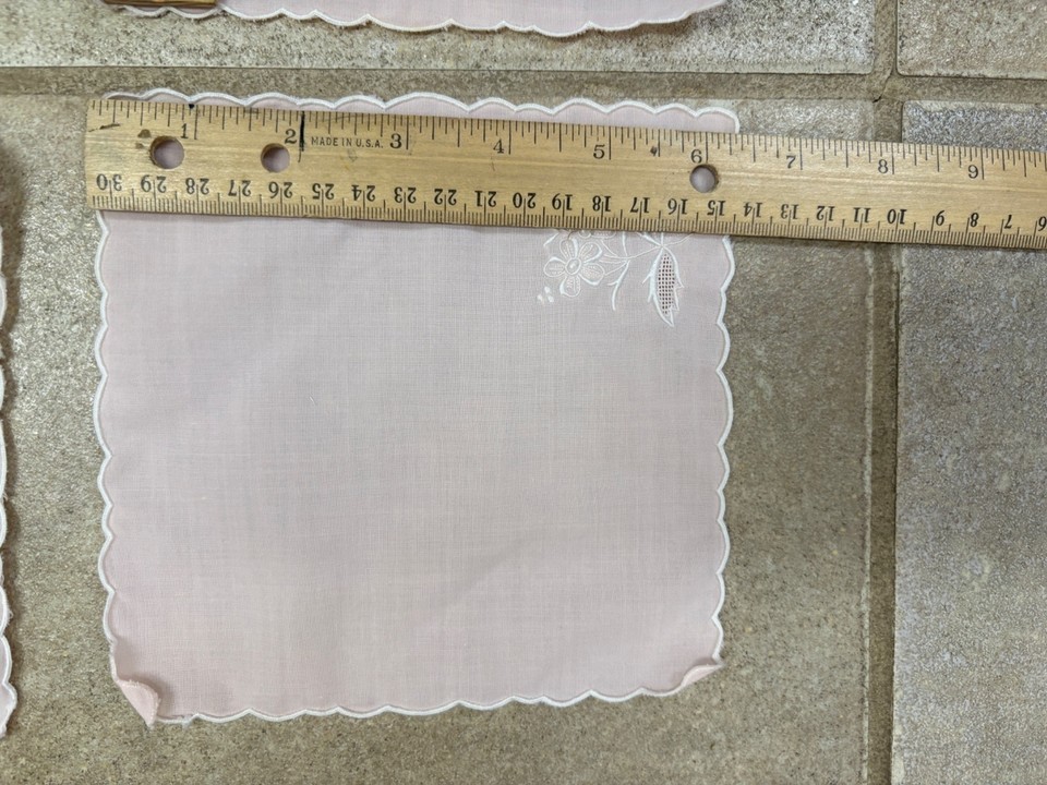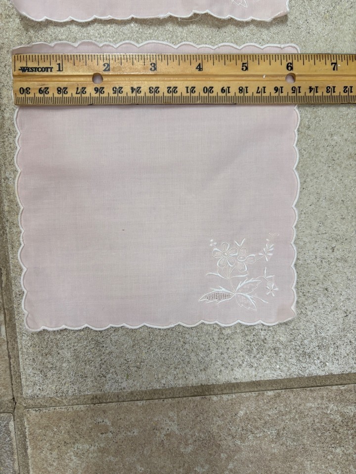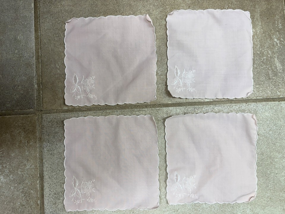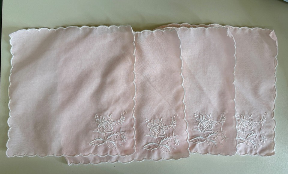 Vintage 4 Pink Embroidered Cotton Handkerchief Napkin Floral Scalloped Victorian