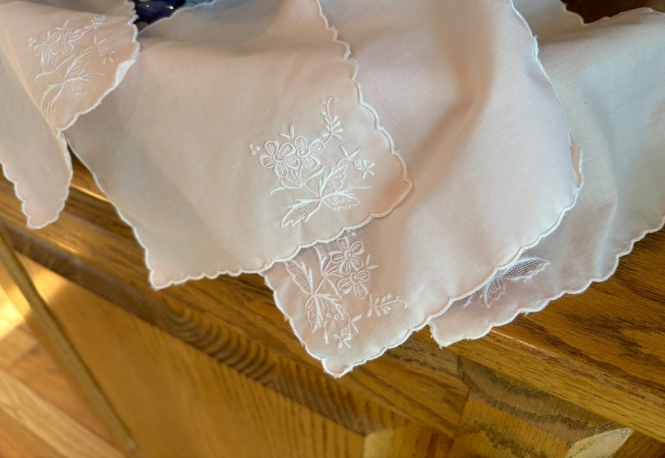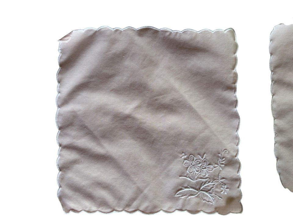 These delicate pink handkerchiefs or napkins adorned with intricate floral embroidery and scalloped edges, evoke a bygone era of grace and refinement. Crafted from soft cotton, they measure 10"x10" and offer both functionality and a nostalgic charm. A timeless addition to any collector's trove or as a thoughtful gift imbued with vintage elegance.
