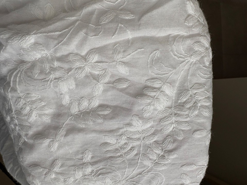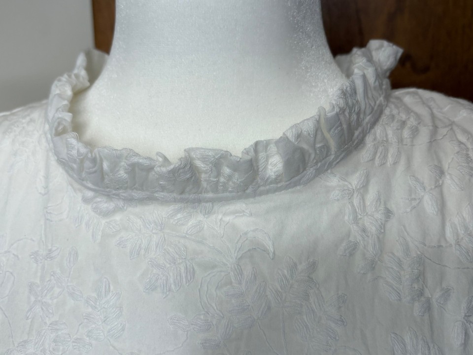 This ethereal white babydoll top features delicate floral jacquard fabric with feminine ruffle details at the neck and sleeves. The flowing silhouette create a flattering, comfortable fit that transitions easily from day to evening wear.