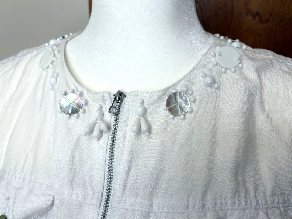 This charming jacket tells a story of effortless grace and sophistication. Crafted with a linen-rayon blend, its delicate embellishments sparkle subtly, capturing the light in an enchanting way. The zip front and ruffled hem add a touch of playful elegance, perfect for embracing beauty in every detail.