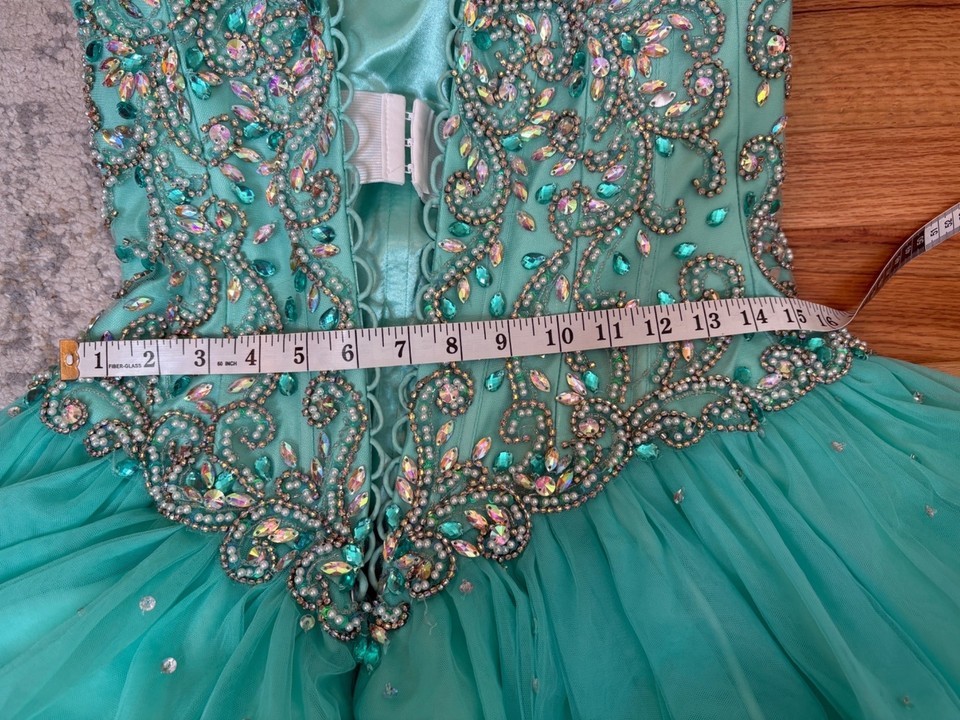 Stunning ball gown with fully beaded corset bodice and full tulle sirt. Sparkling rhinestones, beads, and pearls throughout the bodice. Perfect for Quinceanera, Sweet 16, Prom, or Pageant.