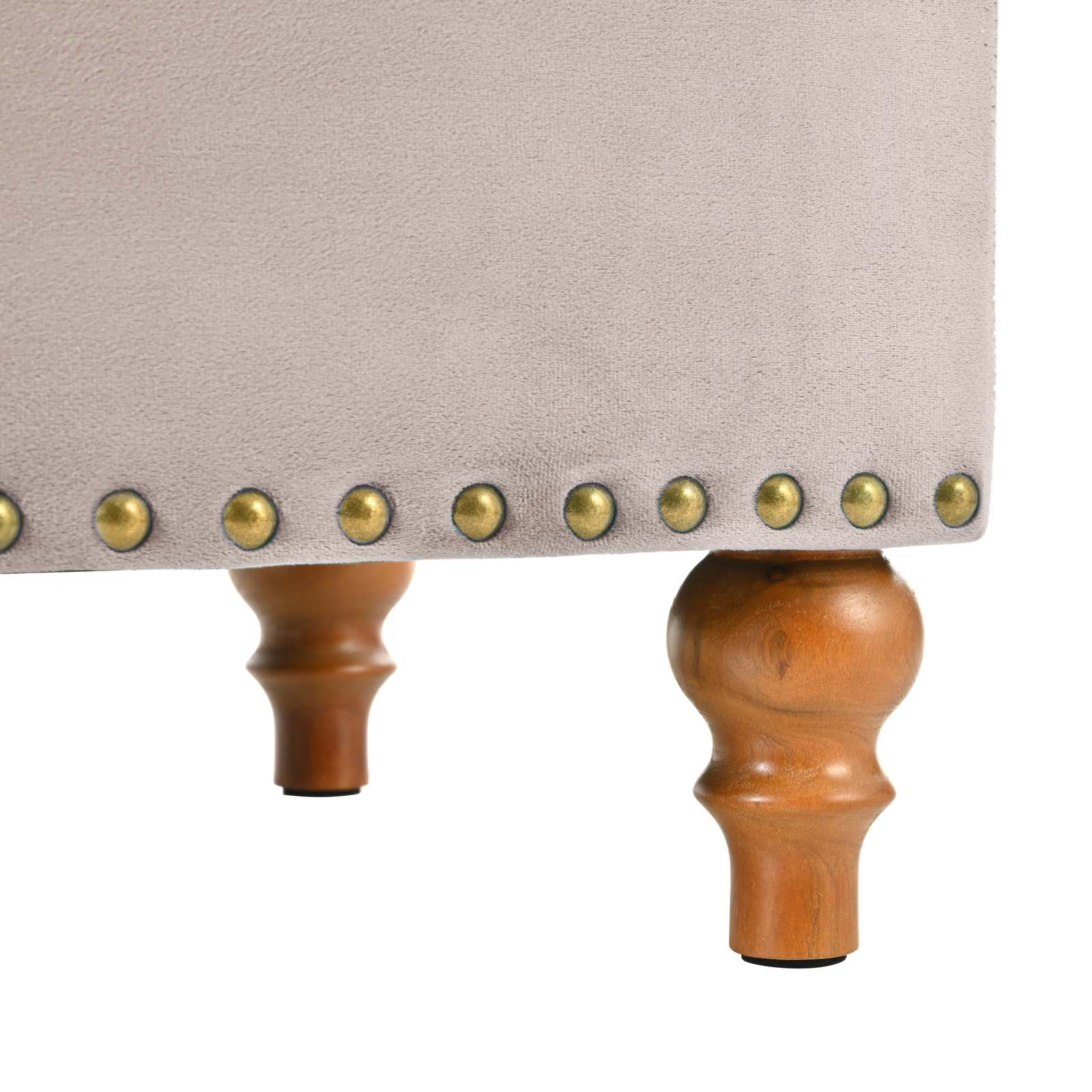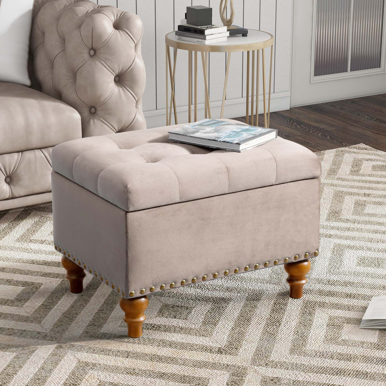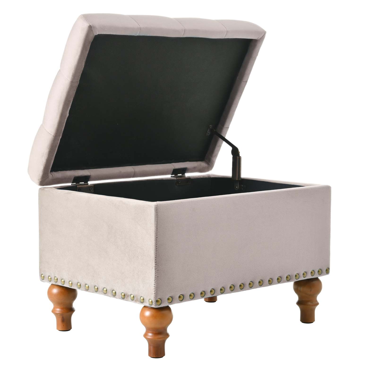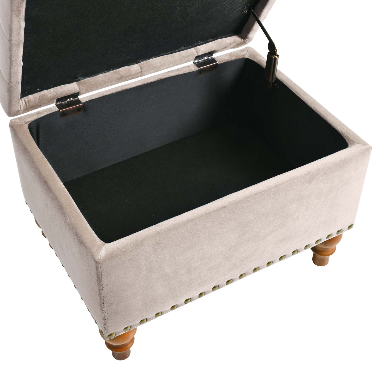 Comfortable and durable:Cream velvet fabric with storage ottoman design, filled with high density sponge makes this ottoman sit very comfortable. With a sturdy solid wood frame, durable wood legs and durable hinges, the padded top can stay open when you open it completely. You don't have to worry about it closing. Designed for long lasting use. Withstand 300 pounds of weight.