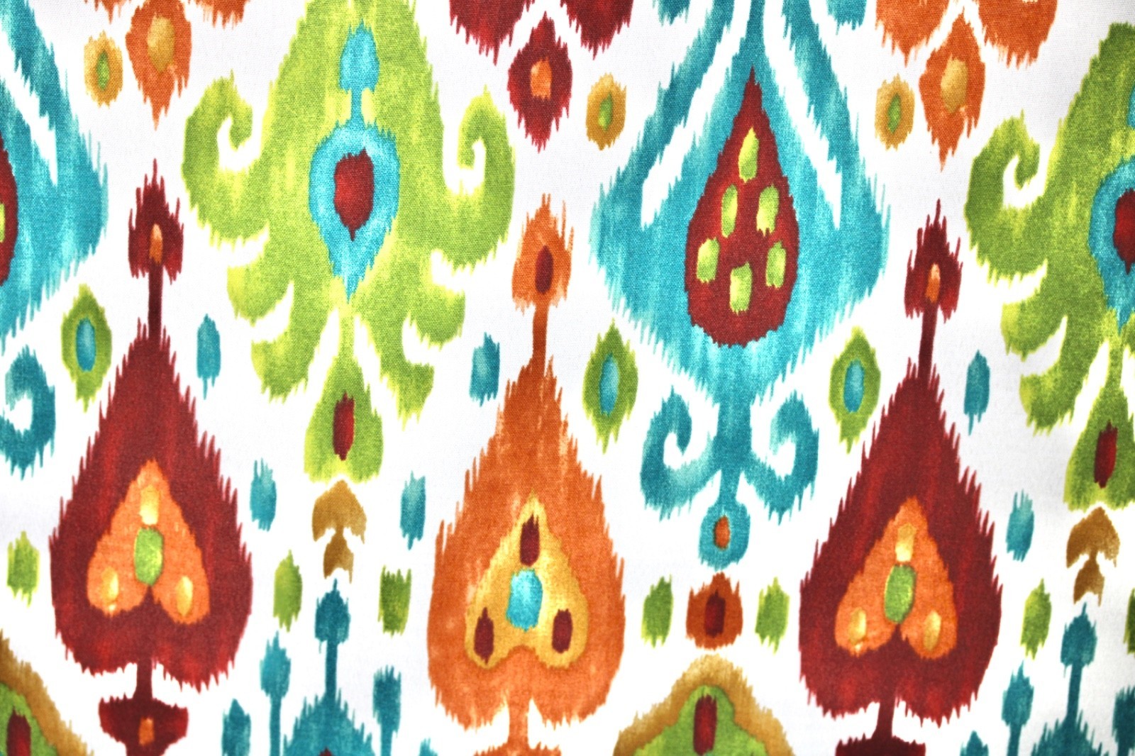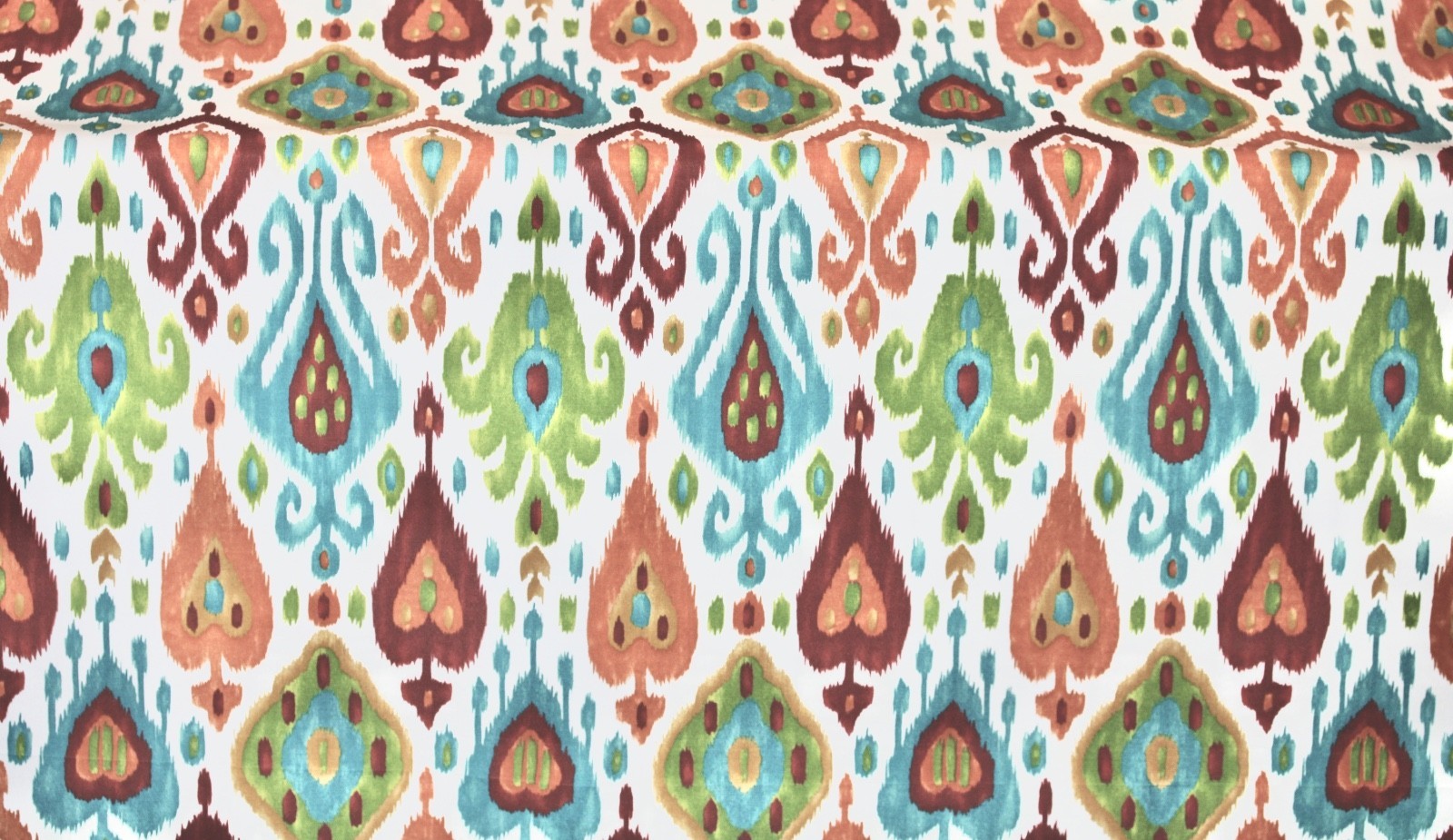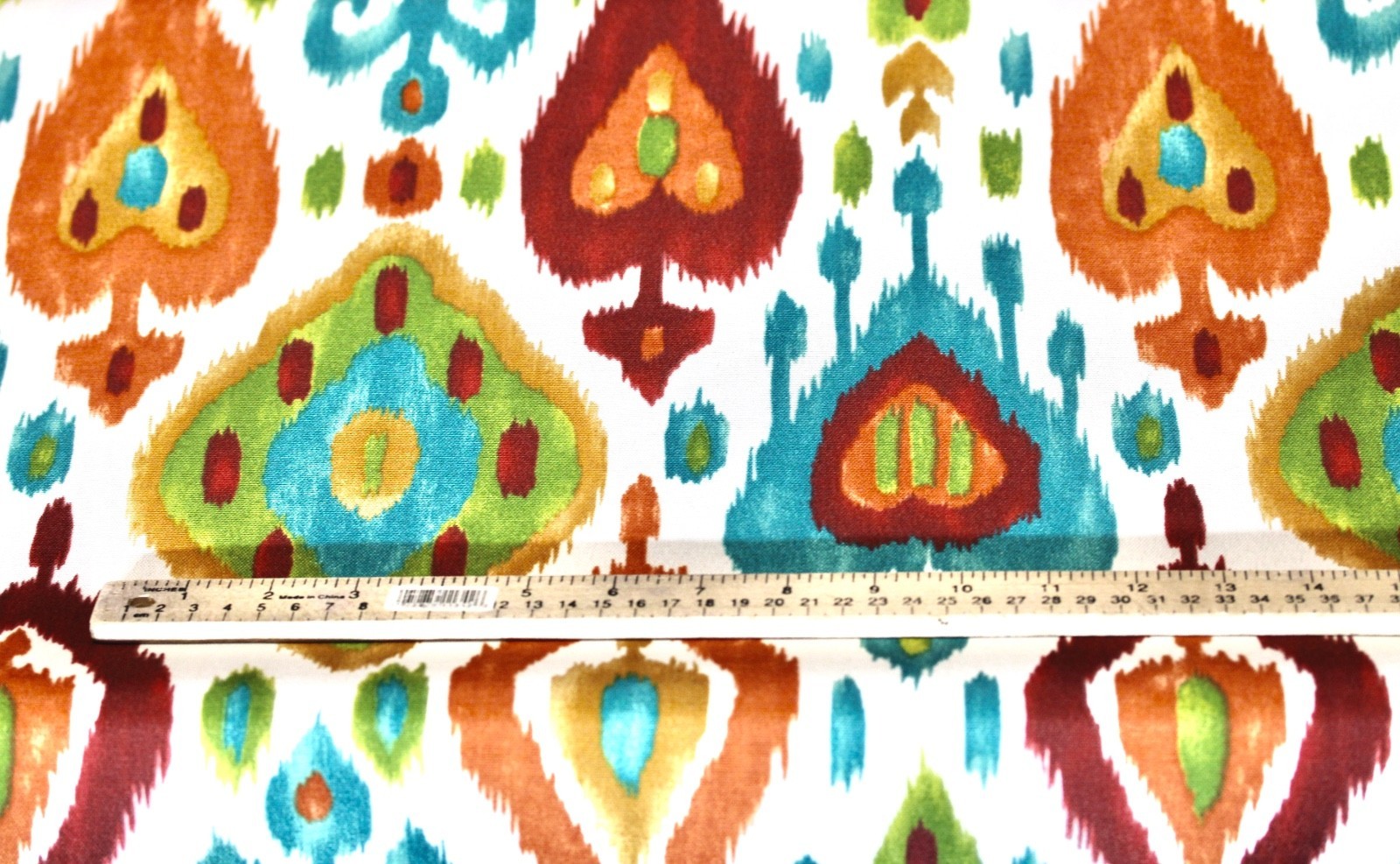 This Solarium Paso Mesa outdoor decorative print features a ikat design in the colors of teal, orange, green and red on a light off white background. It is perfect for outdoor settings or indoors in a sunny room. It is stain and water resistant and can withstand up to 500 hours of direct sun exposure and has a durability rating of 10,000 double rubs. Uses include decorative pillows, cushions, chair pads, tote bags and upholstery.