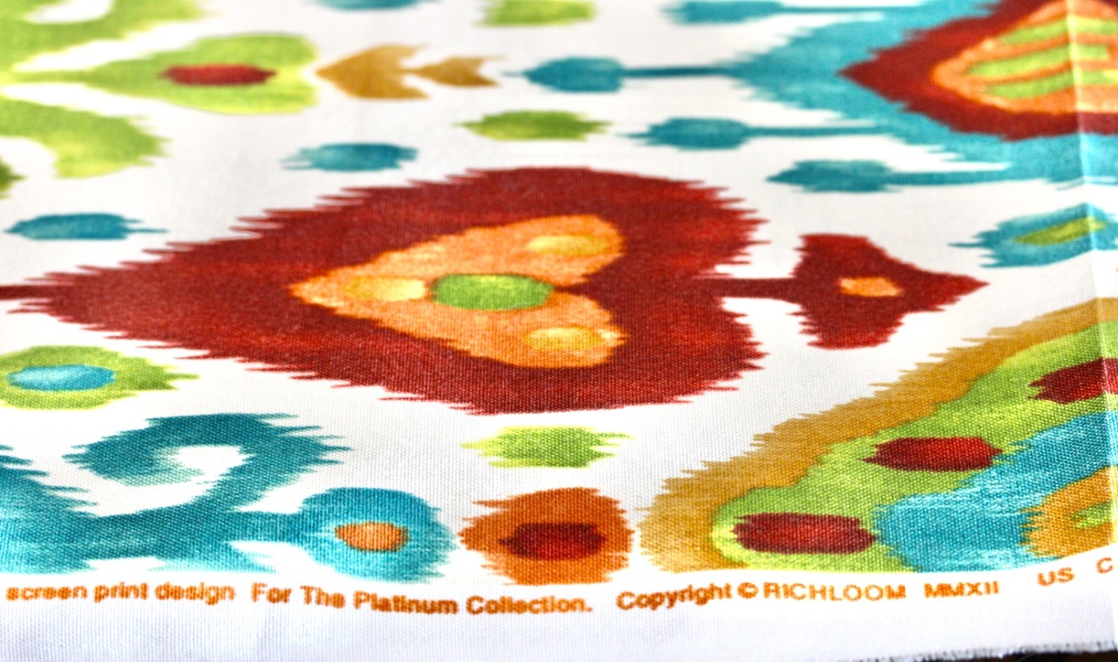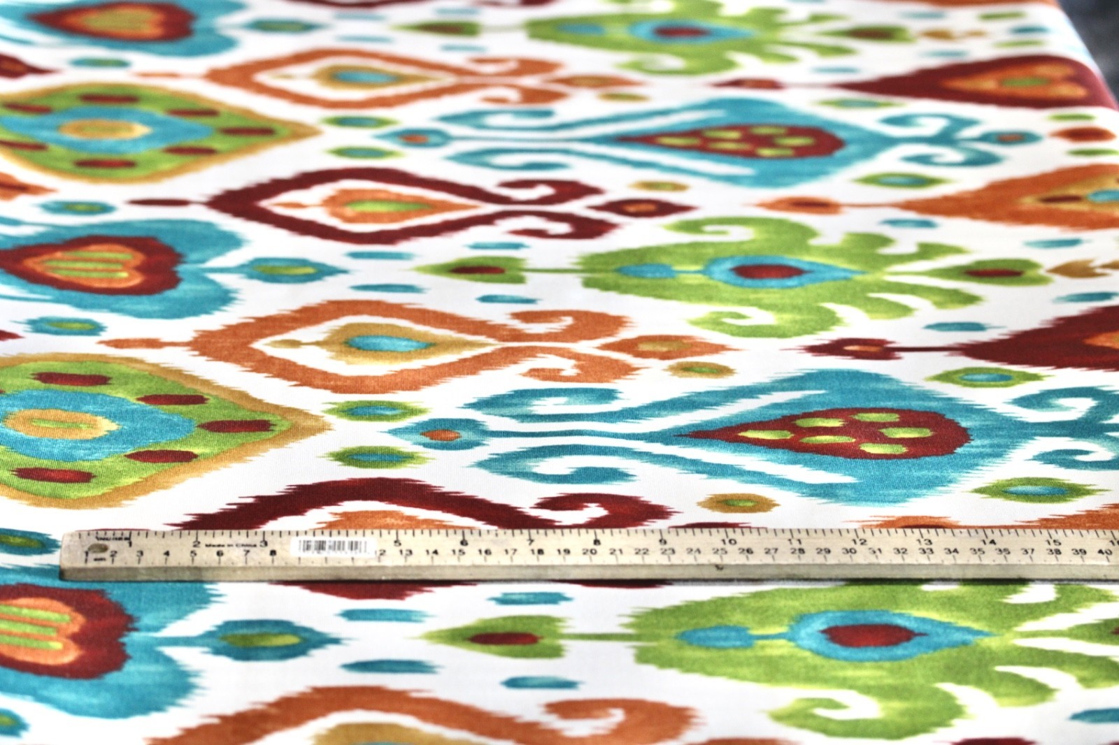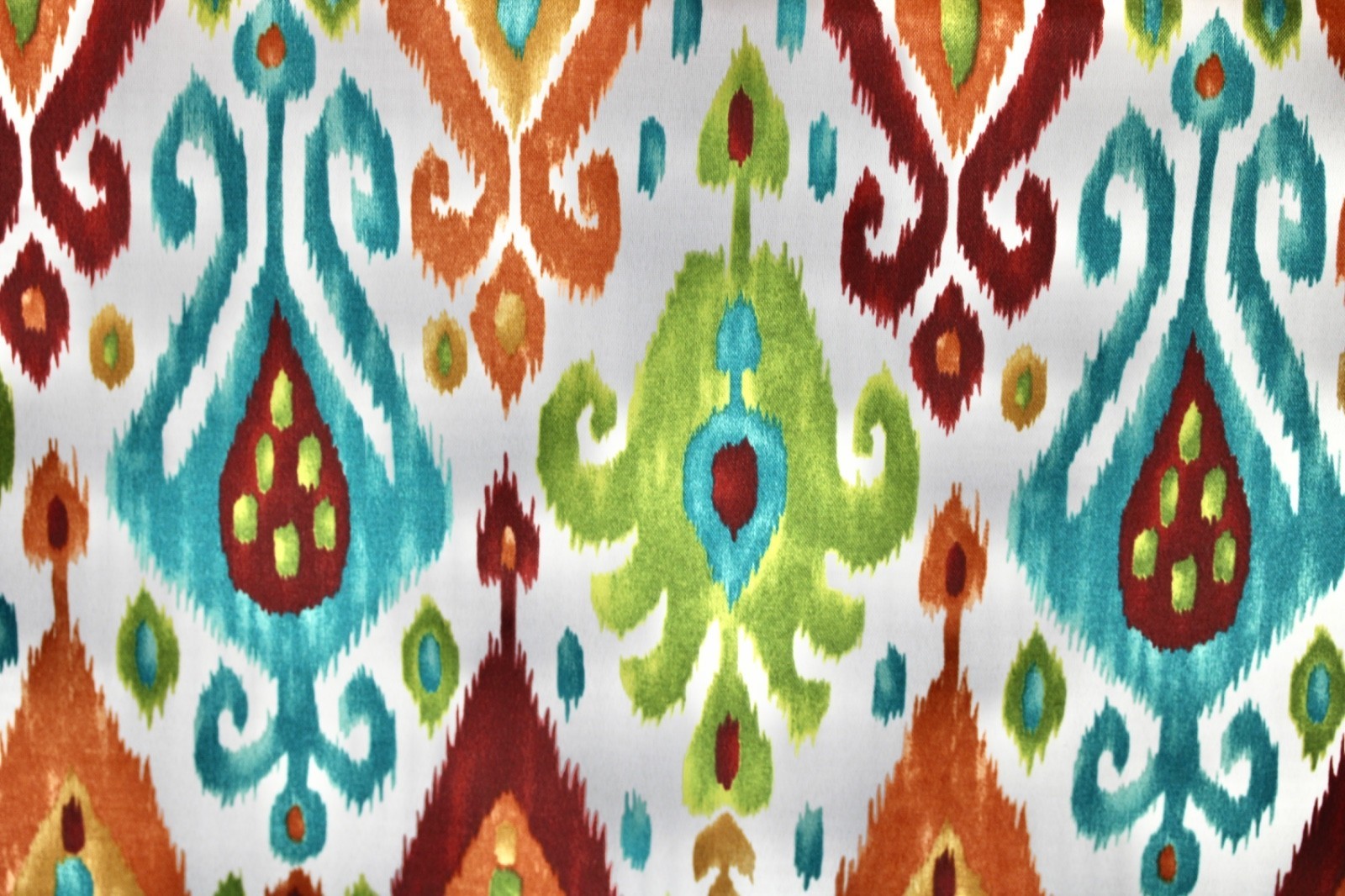 This Solarium Paso Mesa outdoor decorative print features a ikat design in the colors of teal, orange, green and red on a light off white background. It is perfect for outdoor settings or indoors in a sunny room. It is stain and water resistant and can withstand up to 500 hours of direct sun exposure and has a durability rating of 10,000 double rubs. Uses include decorative pillows, cushions, chair pads, tote bags and upholstery.