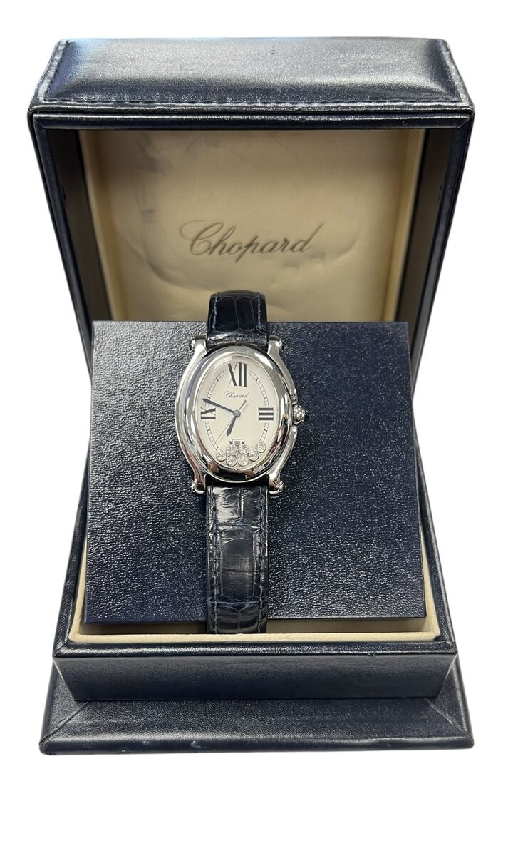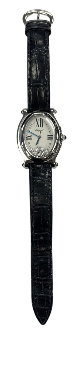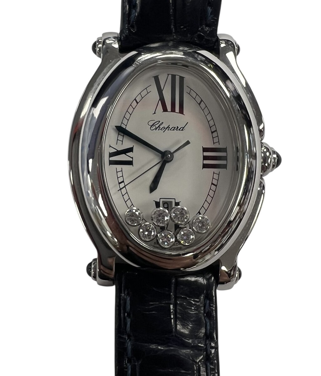 Type: Wrist watchBrand: ChopardModel number: 27/8937-23Model name: Happy SportCase width: 28mmWeight: 29.5Bracelet length: 8"Movement type: Quartz (Battery)Case Material: Stainless SteelBox included: yesPaperwork included: noRunning: yesDial color: WhiteBand material: LeatherStone Quantity: 7Stone Shape: RoundStone Color: ClearStone Carat Total: .25Stone Type: DiamondCondition:Used
