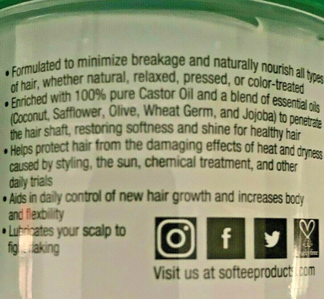 Softee castor oil Conditioner is formulated to minimize breakage and naturally nourish all types of hair Whether natural, relaxed, pressed or color treated. Enriched with pure castor oil and a blend of healing oils to penetrate hair shaft, restoring softness and shine to dull and dry hair.