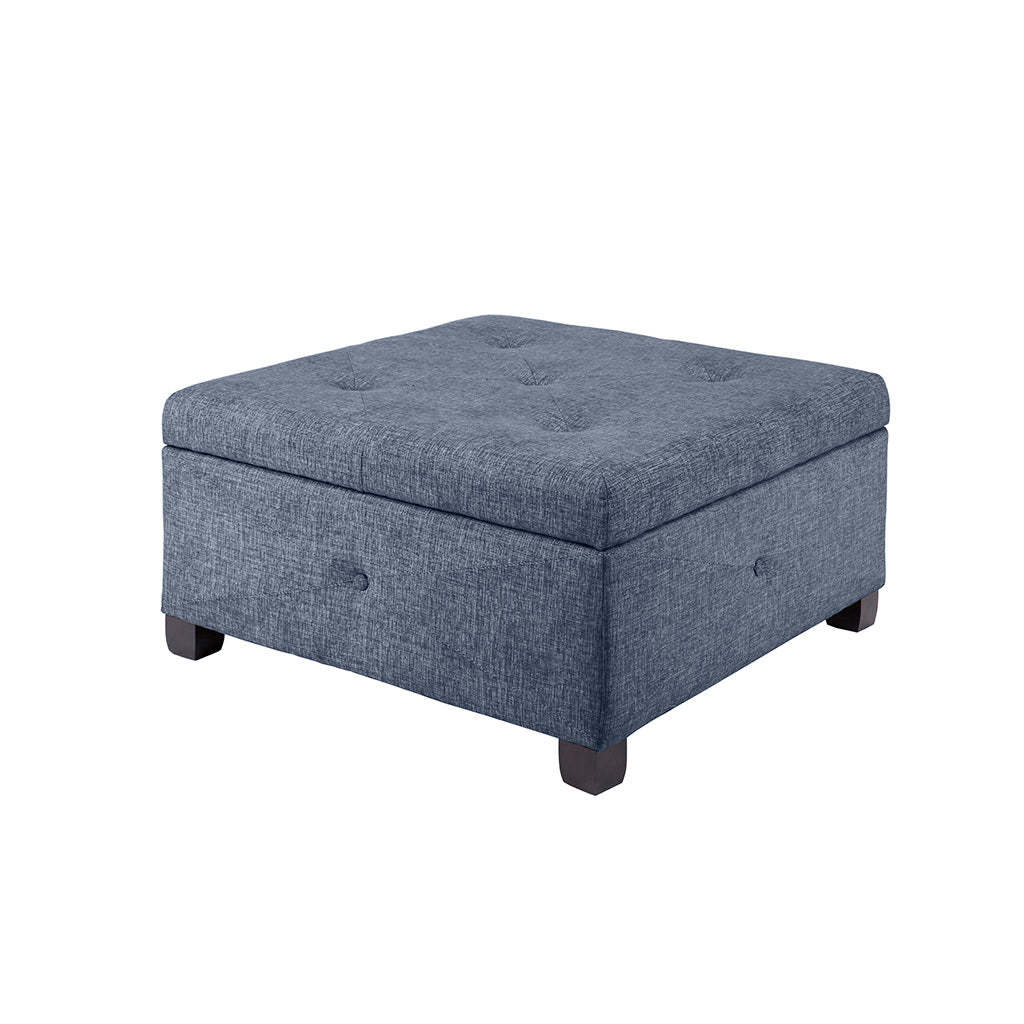 The Madison Park Aspen Ottoman offers a versatile storage option that?s full of style for your home. This square storage ottoman is upholstered in a blue fabric and features button-tufted details on the top and sides that add an elegant touch. Solid wood legs with a dark brown finish complement the upholstery. Providing ample storage space for your blankets and other essentials, this upholstered ottoman makes a great addition to any room in your home. Assembly required.