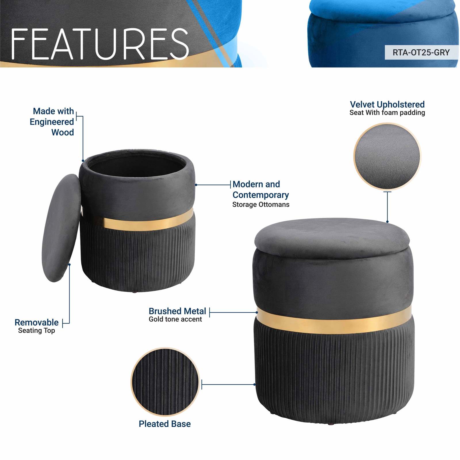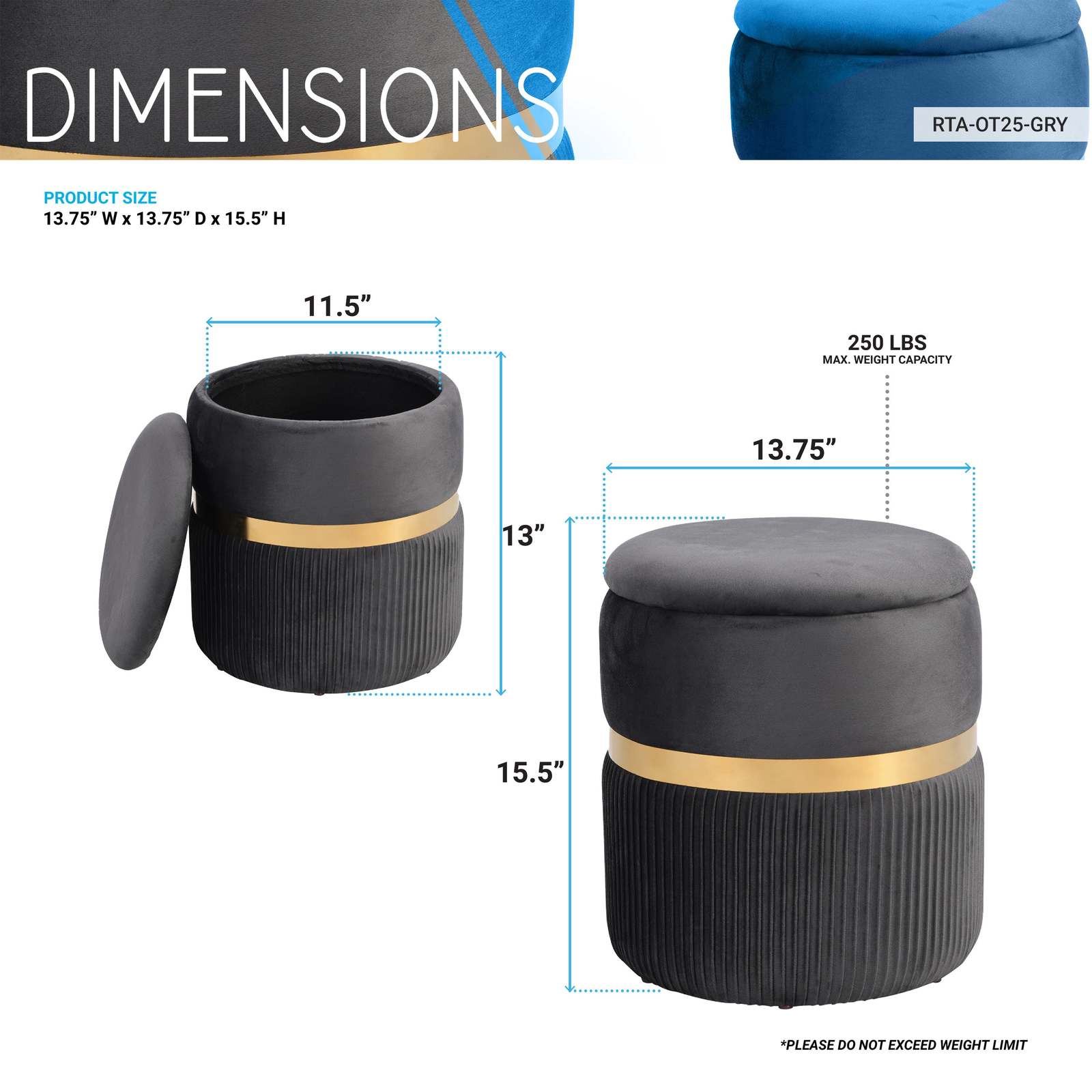 Introducing the ultimate solution to your storage and seating needs - the Tufted, Modern Round Velvet Storage Ottoman! This beautifully crafted piece of furniture is stylish and comfortable and provides ample storage space to keep your home organized and clutter-free. With its plush velvet exterior, and sturdy, round base, this tufted ottoman is the perfect addition to any living room, bedroom, or entryway. Whether you use it as a footstool, extra seating, or even as a coffee table, you'll love its comfort and convenience. Weight limit: 265 lbs. Color: Grey and Gold.