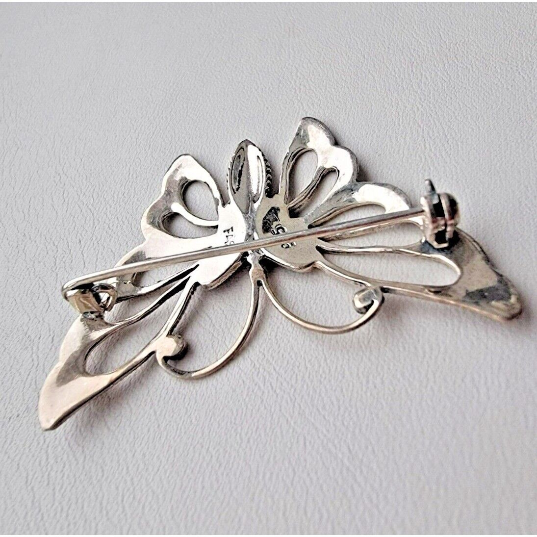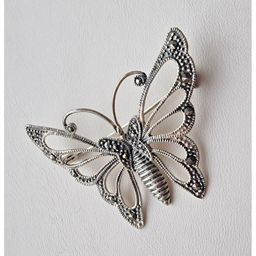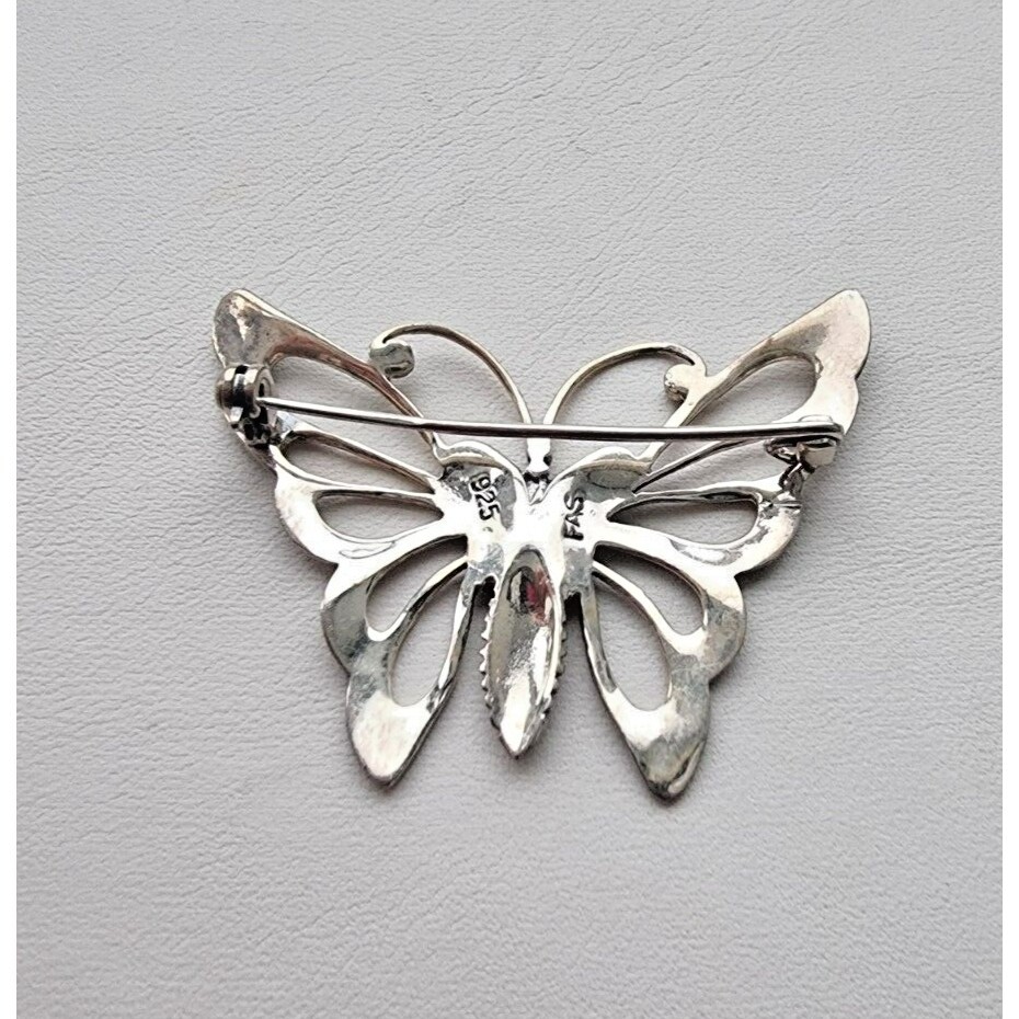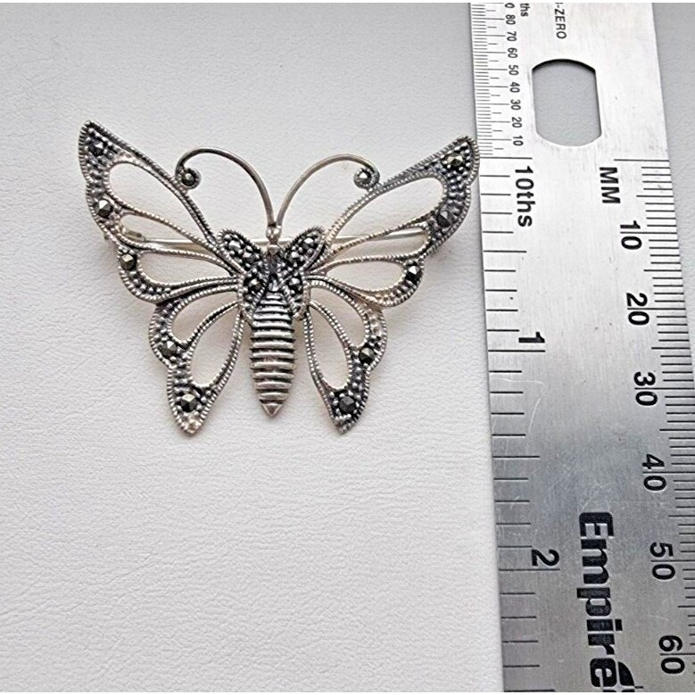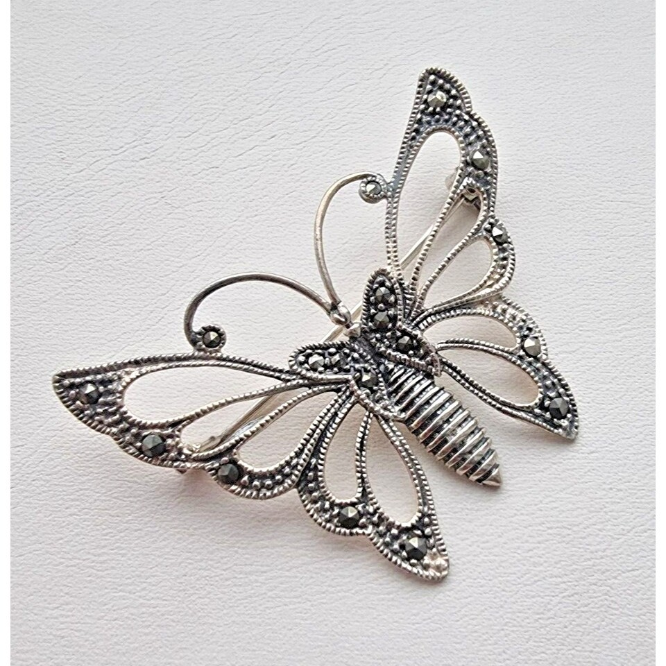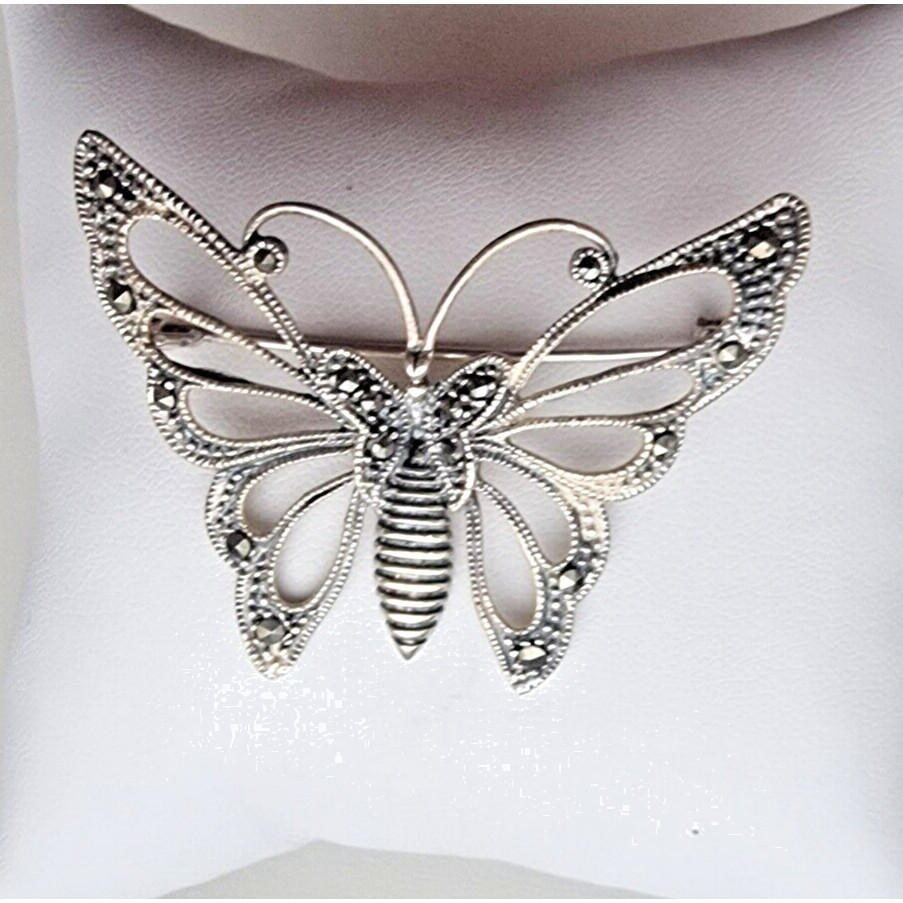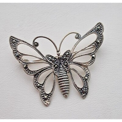 SIZE: APPROX. 1 7/8'' x 1.5''BEATIFUL GIFT BOX INCLUDED!!! This vintage FAS butterfly brooch is crafted from 925 sterling silver and adorned with marcasite stones in a lovely gray color. The butterfly shape and intricate detailing add a touch of beauty to the piece, making it a charming accessory for any outfit. With its classic design and high-quality materials, this brooch is a timeless addition to any jewelry collection.