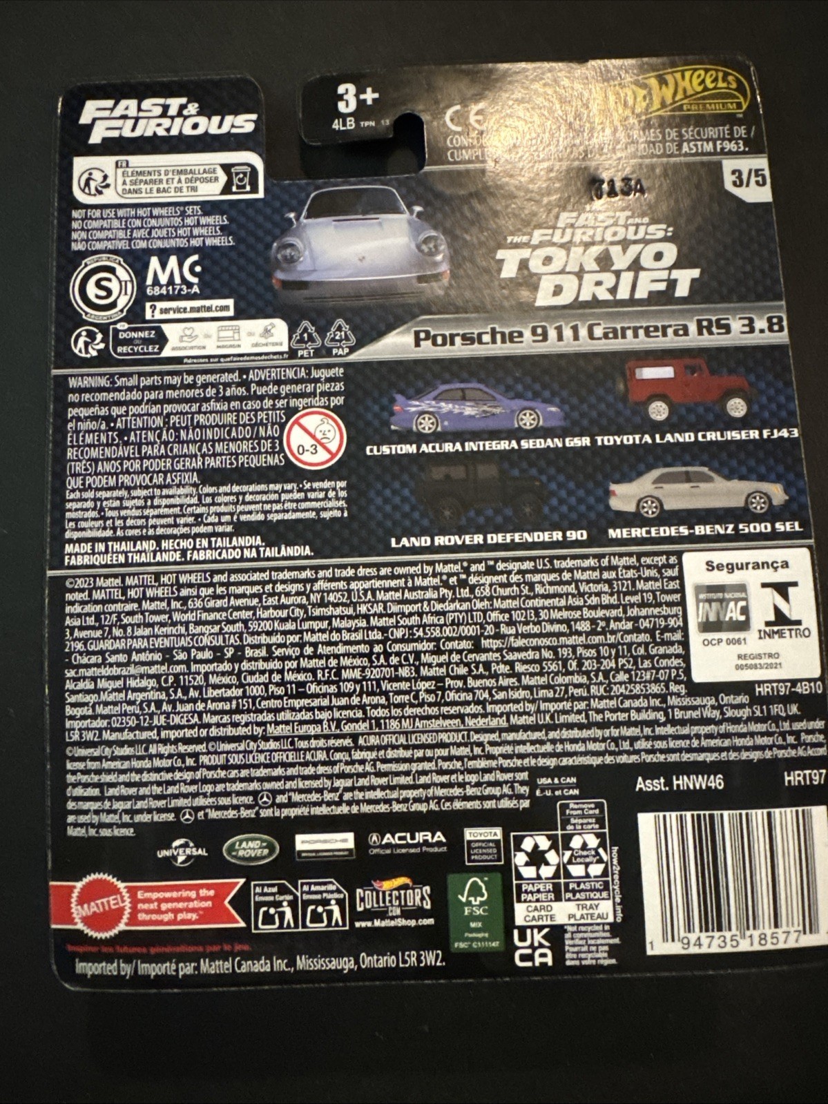 The Hot Wheels Premium Fast Furious Porsche 911 Carrera RS 3.8 in Silver is a diecast toy vehicle made at a 1:64 scale. This model is part of the Fast Furious series and features the iconic Porsche 911 Carrera design. With detailed craftsmanship and a metallic silver color, this real riders toy is a must-have for collectors and fans of the popular movie franchise. The year of manufacture is set at 2023, making it a current and up-to-date addition to any diecast vehicle collection.