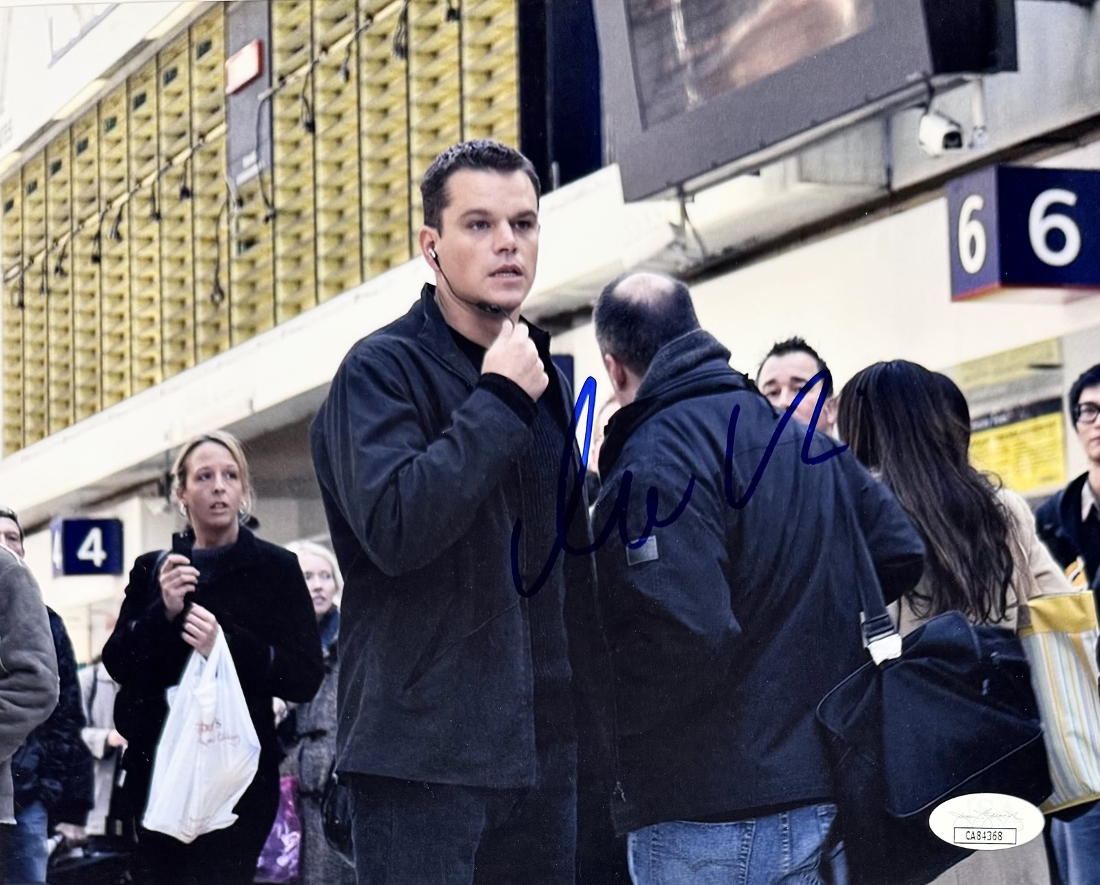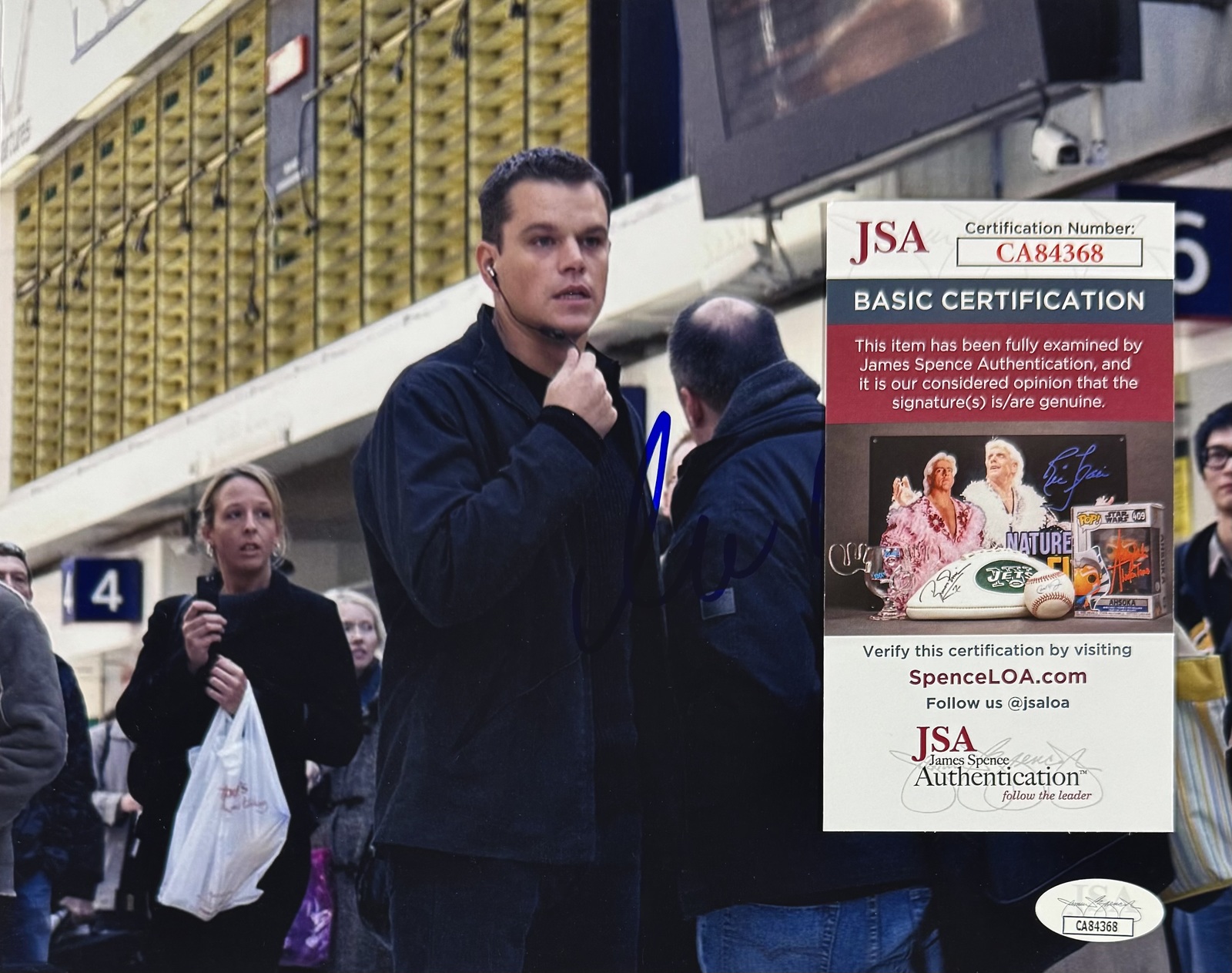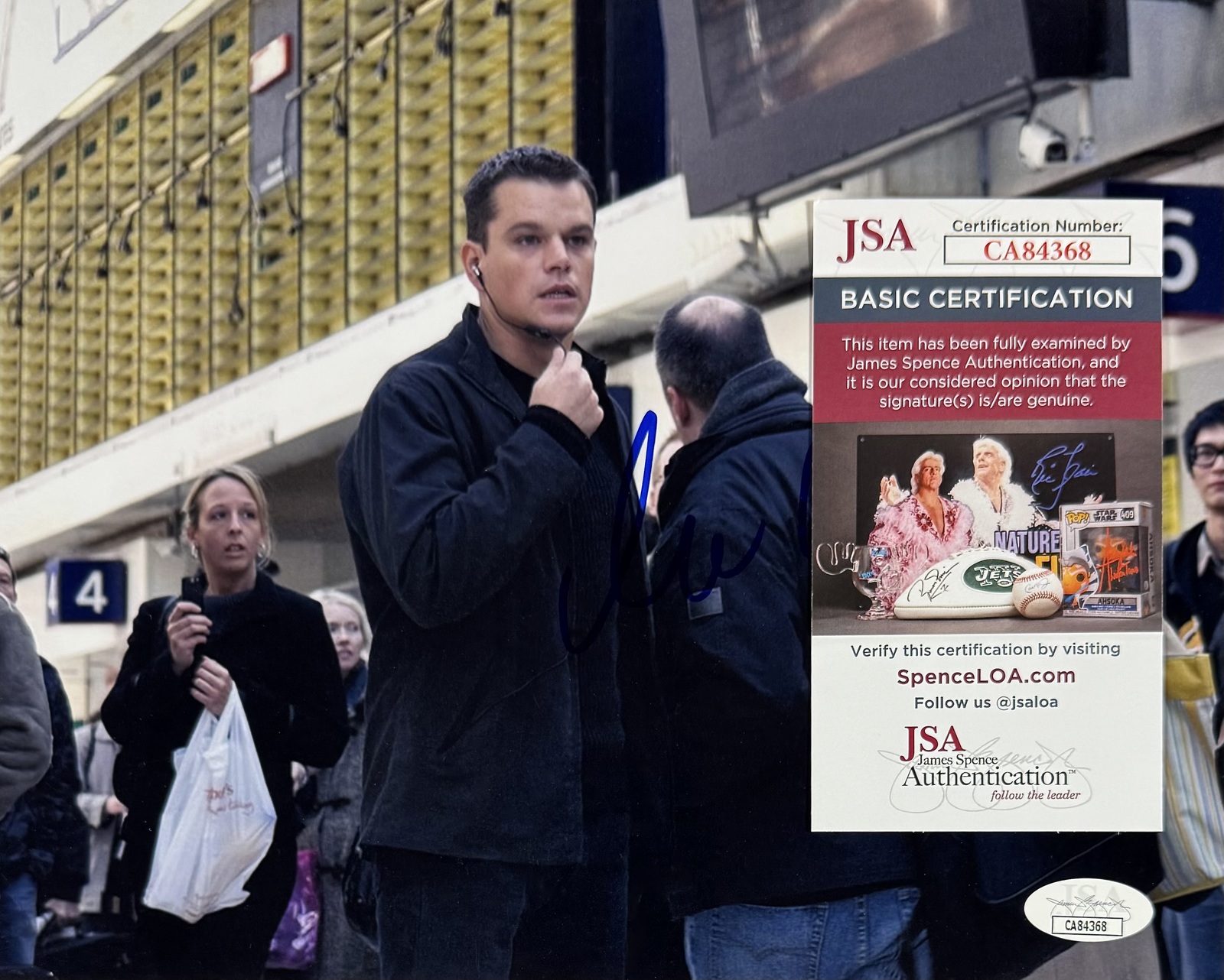 Matt Damon autographed 8"x10" photo from the 2007 film The Bourne Ultimatum signed in blue felt tip marker. This signature has been authenticated by JSA James Spence authentication Certification Number: CA84368 and will come with the matching cert card seen in the scans. He is an American actor, producer, and screenwriter. He won an Academy Award for Best Original Screenplay for co-writing Good Will Hunting (1997) with Ben Affleck, and was nominated for Best Actor for his performance in the same film. Movies include Good Will Hunting (1997), Jason Bourne (2016), The Martian (2015), The Odyssey (2026), The Bourne Identity (2002), Interstellar (2014), The Departed (2006), Ford vs. Ferrari (2019), Ocean's Eleven (2001), Saving Private Ryan (1998), The Talented Mr. Ripley (1999), Euro Trip (2004), The Great Wall (2016), Oppenheimer (2023), The Bourne Supremacy (2004), We Bought a Zoo (2011), Downsizing (2017), The Bourne Ultimatum (2007), The Last Duel (2021), Elysium (2013), Air (2023), The Investigators (2024), Stillwater (2021), Rounders (1998), The Rainmaker (1997), Dogma (1999), The Adjustment Bureau (2011), Mystic Pizza (1988), Ocean's Twelve (2004), Green Zone (2010), Contagion (2011), The Legend of Bagger Vance (2000), True Grit (2010), Ocean's Thirteen (2007), Invictus (2009), Behind the Candelabra (2013), The Good Shepherd (2006), The Accountant 2 (2025), Thor: Ragnarok (2017), School Ties (1992), Hereafter (2010), Deadpool 2 (2018), Suburbicon (2017), Spirit: Stallion of the Cimarron (2002), The Informant! (2009), Ponyo (2008), Syriana (2005), All the Pretty Horses (2000), The Brothers Grimm (2005), The Rip (2025), and The Monuments Men (2014). This photo will come in a clear hard top load for display. Buy with confidence we have been selling autographs since 1992.