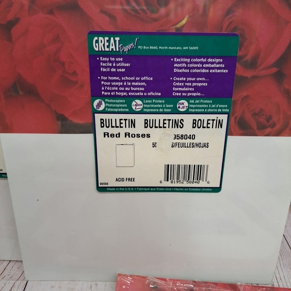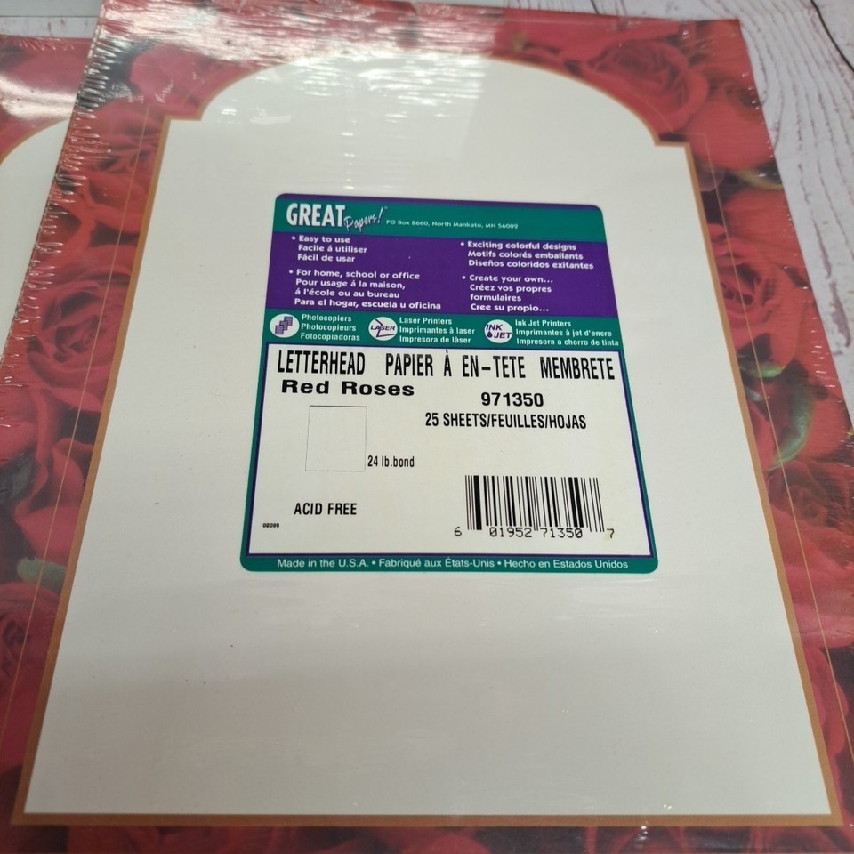 The product is a lot of 5 packs of red rose-themed letterhead and bulletins by Great Papers. This office stationery is perfect for adding a touch of elegance and sophistication to any business or personal correspondence. Each pack contains high-quality paper featuring a beautiful red rose design, making it ideal for creating professionally-looking documents and announcements.
