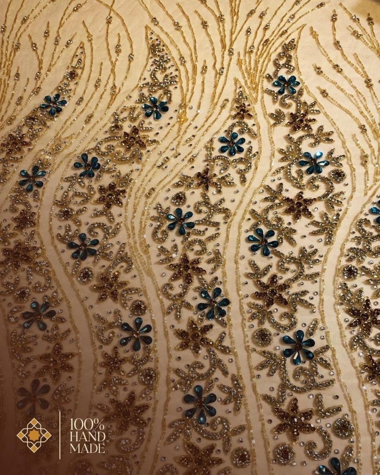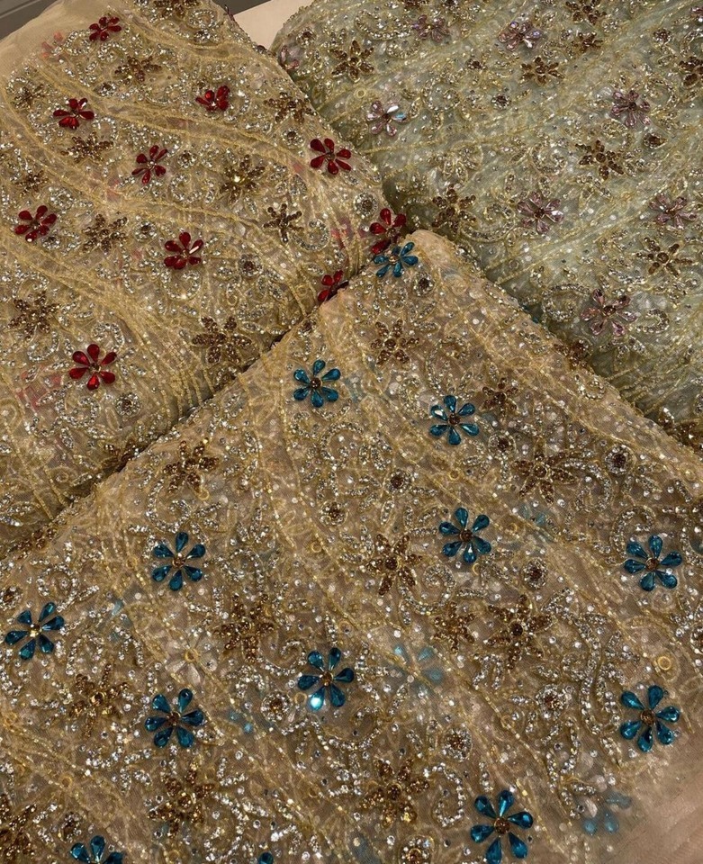 Embrace sophistication with Mk Zariwala's beaded lace fabric, an exquisite choice for an array of creative projects and fashion statements. This medium-weight lace material showcases a unique stones pattern, lending a touch of elegance to any application. Ideal for wedding, prom, and costume design, it can be tailored to make accessories, bags, dresses, quilts, or even upholstery.