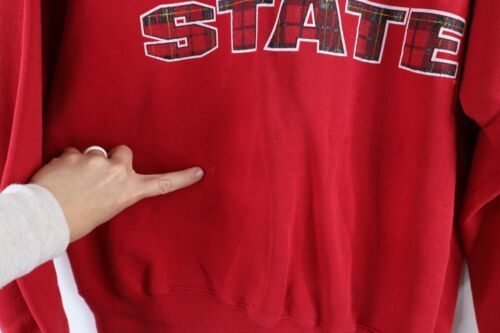 Has stains on front bottom right and both arms. USA Made
