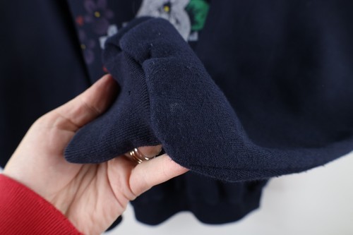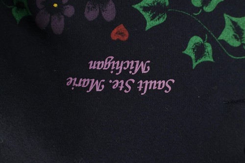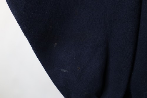 Stains both arms. Graphics faded. Color faded. Has pilling. USA made