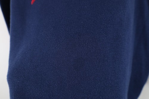Stains, dark spots front. Collar, cuffs discolored. Design distressed. Color faded. Pilling