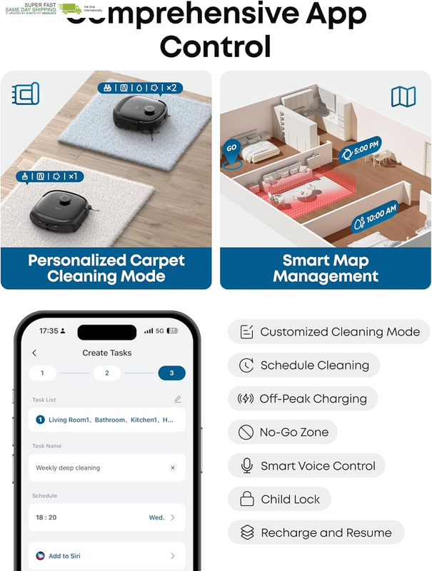 1 Smart App Control 2 Matter Protocol Supported 3 Smart Voice Control 4 Multi-level Mapping 5 Customized Cleaning