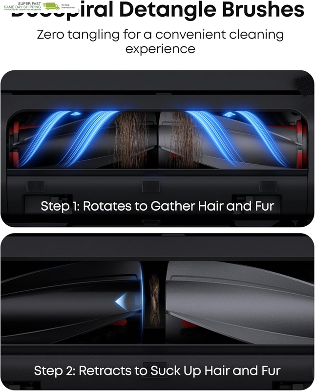Anti-Tangle DuoSpiral Brushes: Less Maintenance, No More Hair Wrap, Clogs, or Daily Brush Cleaning,providing a hassle-free cleaning experience.