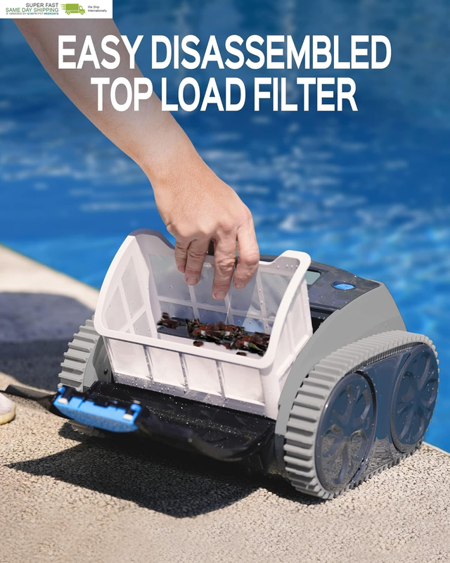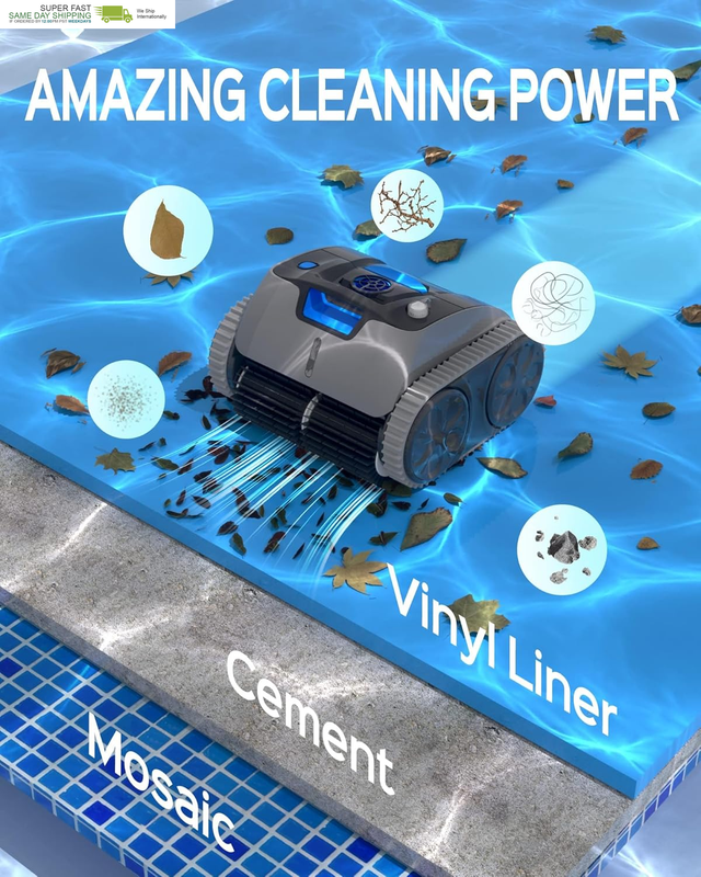 ?Cordless Strong Suction?Unleash the freedom of a cordless clean with this pool cleaner. Equipped with a powerful three-axis brushless motors and 2642 GPH powerful suction, it efficiently picks up sand, dirt, leaves, twigs, dust, and debris.