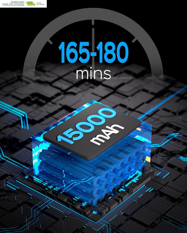 ?180mins Long-Lasting Runtime? With a massive 15000 mAh capacity and the use of a safe, high-density lithium polymer battery module, which is more compact and has a larger battery capacity, it surpasses traditional Lithium-ion batteries in safety.