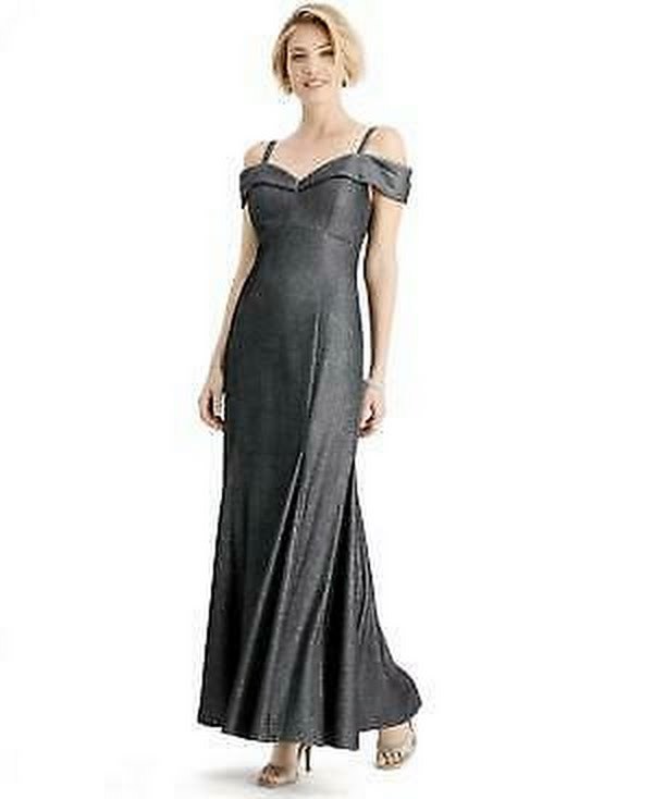 Perfect for your next event, this gorgeous metallic gown from R M Richards features a romantic sweetheart neckline and cold-shoulder cutouts. Allover silver-tone metallic finish; flounce hem Hidden back zipper with hook-and-eye closure Imported Short sleeves with cold-shoulder cutouts Sweetheart neckline; Mermaid silhouette Shell, lining: polyester Spot clean
