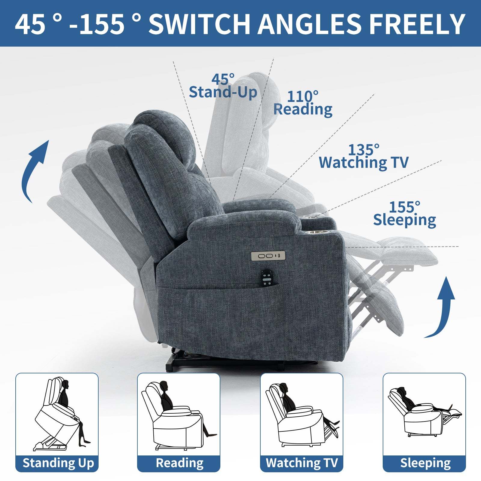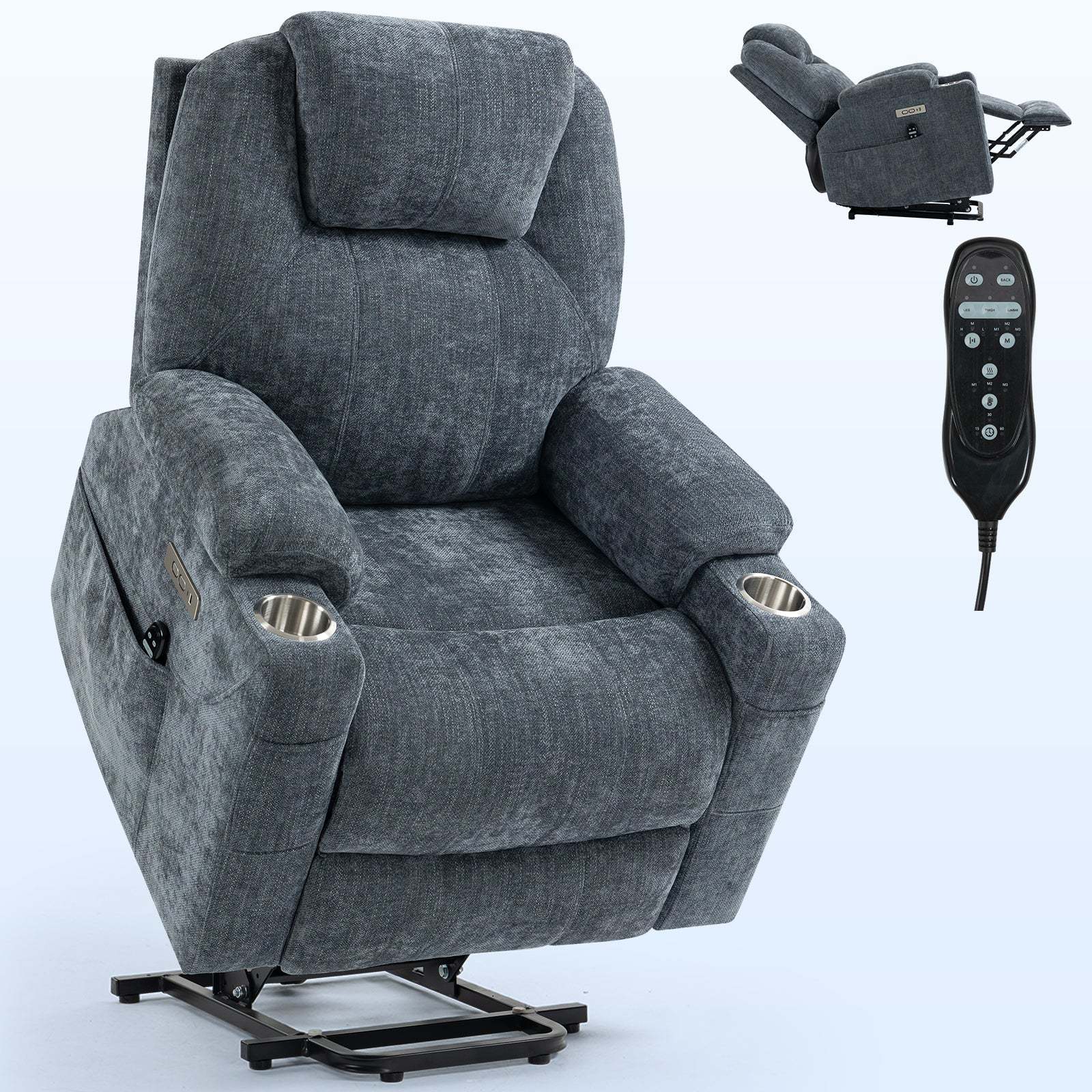Blue Chenille Power Lift Recliner: Massage, Heat, USB, 350 LBS